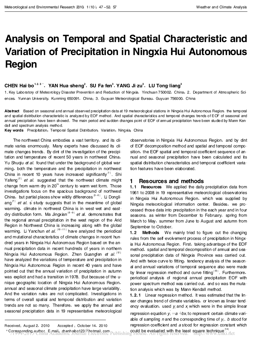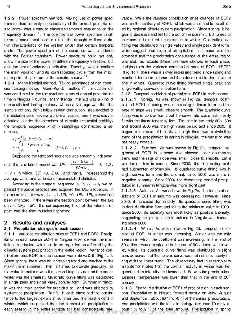摘要:针对地处西北内陆的宁夏全境19个气象观测站的年、季降水资料,利用EOF分解方法进行了时空分解,分析了其年、季降水的EOF1和EOF2空间分布特征和时间系数变化趋势,并利用谱分析方法和M-K方法对年降水资料的EOF1和EOF2时间序列进行了周期分析和突变分析,得出了其主要变化周期和突变时间点。