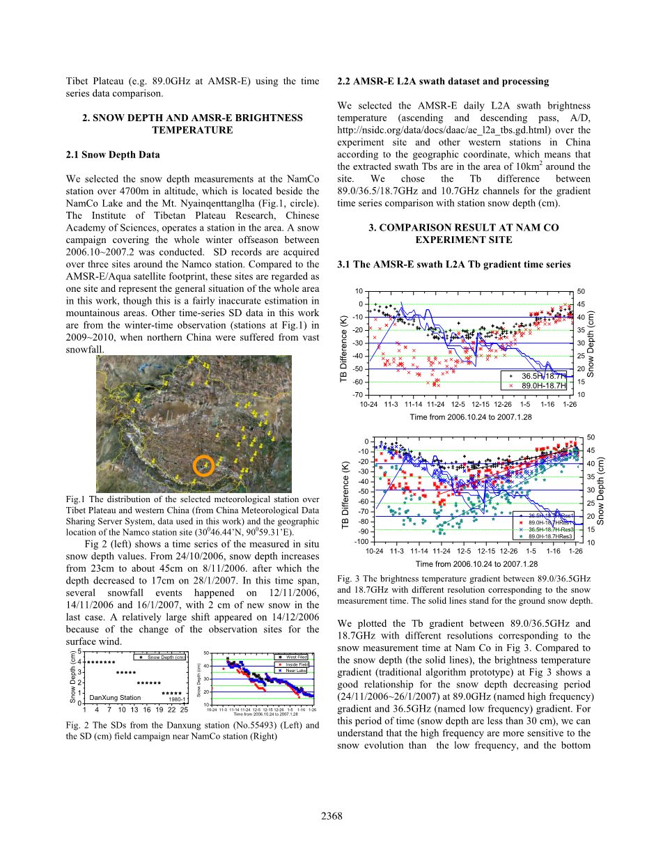 我们选择位于纳木措湖和唐古拉山脉旁边高度超过4700m的纳木措站的积雪深度测量值(图1,圈)。 中国科学院青藏高原研究所在该地区设有一个台站。 在2006.10〜2007.2之间进行了整个冬季休赛期的积雪活动。 SD记录是在纳木措站周围的三个站点获取的。 与AMSR-E / Aqua卫星覆盖区相比,这些地点被认为是一个地点,代表了整个地区的总体情况,尽管这在山区是相当不准确的。 本工作中的其他时间序列标准差资料来自于2009〜2010年的冬季观测资料(图1中的台站),当时中国北方出现了大范围的降雪。