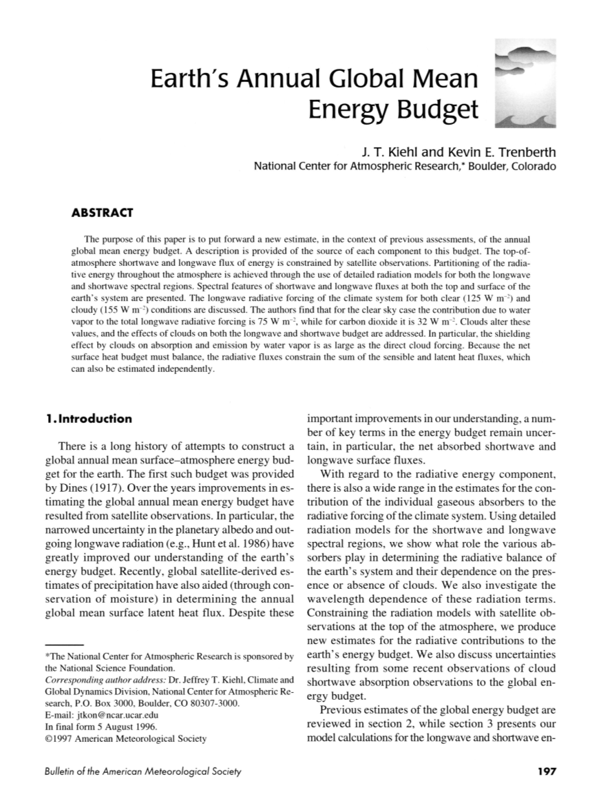 很长时间里人类都试图搞明白地球的全球年平均的地气系统能量收支情况。第一个收支情况估计是有Dines在1917年给出的。这些年的卫星观测结果改善了我们对于全球年平均能量收支的估计。特别是在行星反照率和出射长波辐射方面不确定度的缩小提高了我们对地球能量收支的认识与理解。近些年,全球卫星驱动的对于降水的估计同样在决定全球年度平均地表潜热通量起到了作用。尽管我们有了这些在认识理解上的重要提高,但是还有很多对于能量收支的重要关键因素没有搞明白,特别是短波净吸收和长波表面辐射通量。