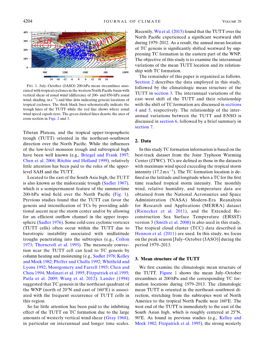 本文的其余部分安排如下。第2节描述了本研究所采用的数据,其次是第3节TUTT的气候平均结构.TUTT东西向位移的年际变化及其与TC形成变化的关系在第4节和第5。 第6节讨论了TUTT和ENSO年际变化的关系,随后在第7节作了简要总结。