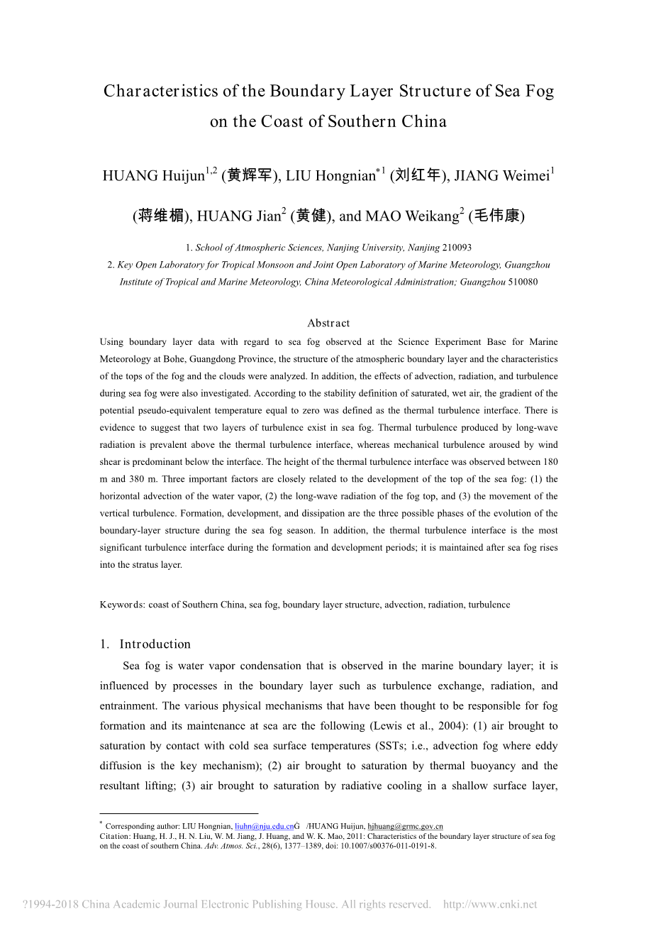 关键词:华南沿海,海雾,边界层结构,平流,辐射,湍流