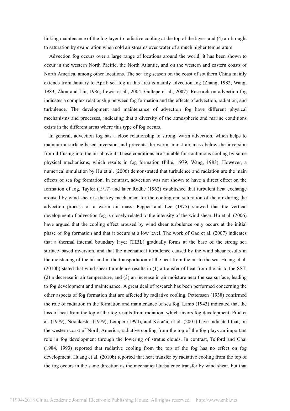 这一地区的海雾主要是平流雾(Zhang,1982; Wang,1983; Zhou and Liu,1986; Lewis et al。,2004; Gultepe et al。,2007)。对流雾的研究表明雾的形成与平流,辐射和湍流的影响之间存在着复杂的关系。平流雾的发展和维持具有不同的物理机制和过程,表明在发生这种类型的雾的不同地区存在多种大气条件和大气条件。