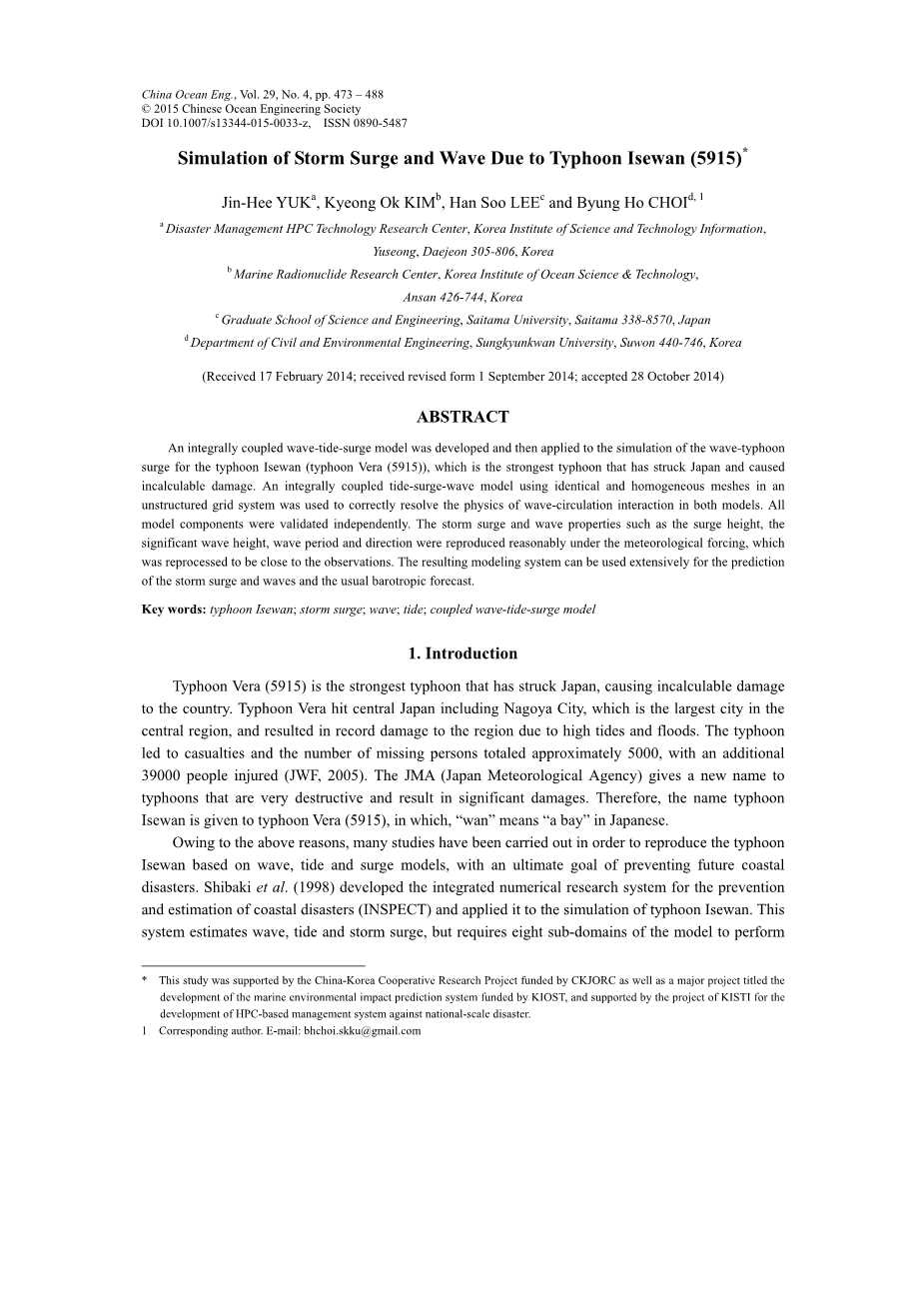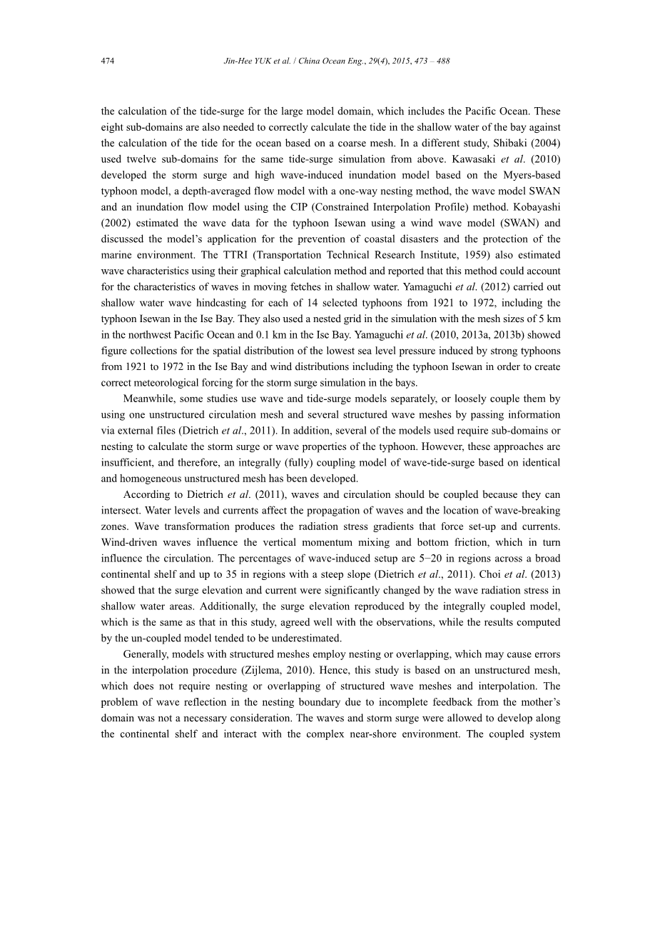 如上所述,许多研究都集中在伊势湾台风,有明显的破坏力,为了研究海岸带灾害防治。我们也选择了同样的原因,尽管这是一个古老的自然灾害台风。我们也选择了这个台风的海浪和风暴潮的模拟,因为即使伊势湾台风发生在半个世纪前,有几个观察和证明文件有助于研究。此外,发达的伊势湾台风仿真模型的几篇论文中,在这项研究中所采取的方法,不仅基于完全耦合模型的波潮潮也在非结构网格上,这在以前从未有过。在本研究中介绍的建模系统和它的长处在下一节中详细描述,并解释了以前。在本研究中引入的整体耦合波潮模型也被用于模拟其他台风,可以重现风暴潮和波的属性合理(Choi et al.,2013;基姆等,2013a,2013b)。因此,在以前的研究中证明了这种耦合模型的再现。在这项研究中,我们专注于一个显着的台风和分析其波和风暴潮从各个领域,使用一些观察和研究。这是一个重大的成就,能够重现一个关键问题,使用适当的预测工具,因为它是在这项研究中完成。该建模方法和结果在建模系统的回报和浪潮预测中的应用讨论。