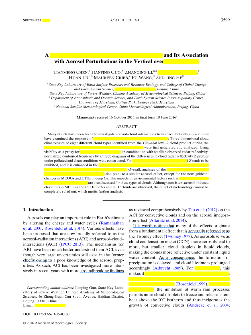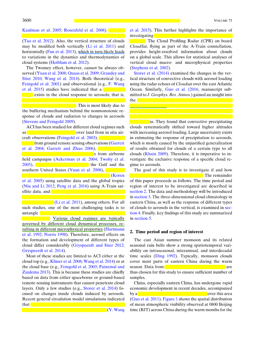 Storer等人(2014)通过对东大西洋云层的雷达回波,研究了气溶胶载荷对对流云层垂直结构的变化。同样,Guo等人(2016,提交给J. Geophys. Res. Atmos.的手稿)通过热带降雨测量任务(TRMM)卫星上的降水雷达数据和基于地面的气溶胶观测数据,了解了气溶胶对降水云内部结构的影响。他们发现,对流降水云携带着增多的气溶胶负荷有系统地向更高的海拔高度转换。在估算降水对气溶胶的反应时存在很大的不确定性,这主要是由于对某一种云的云所获得的结果的不合理的泛化所引起的(Khain 2009)。因此,必须研究特定云机制对气溶胶的排他性响应。