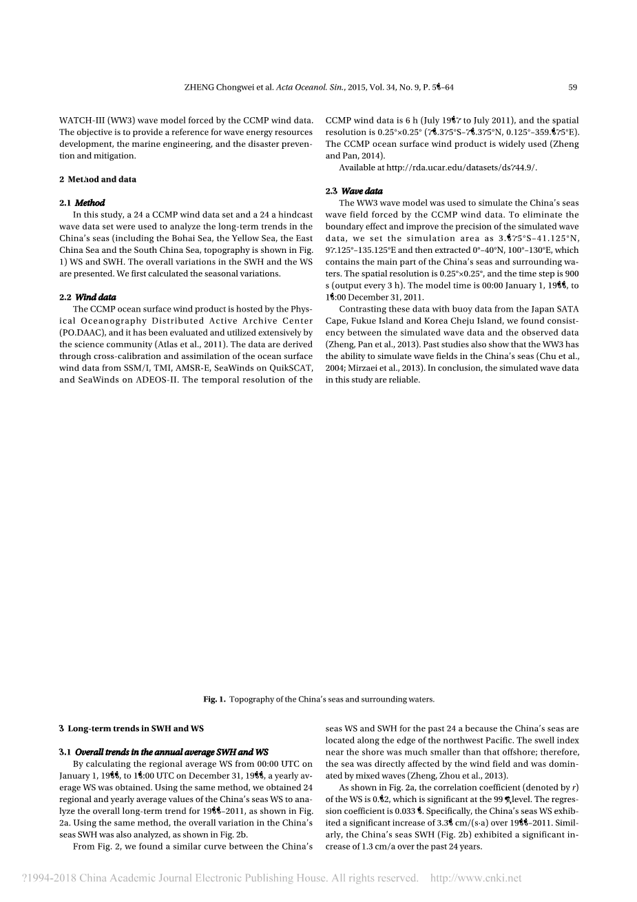 然而, 对关于中国海域的WS和SWH的总体气候趋势和气候趋势的季节性特征的研究很少。在海洋工程或海洋能源开发过程中, 我们通常关注WS和SWH长期趋势的季节性特征, 这些趋势与不同季节的规划有关。本研究基于 24 a (1988–2011) 交叉标定、多平台 (CCMP) 风资料和通过CCMP风力数据强制的WAVEWATCH-III(WW3)波浪模型获得24个后波资料,提出中国海域WS和SWH长期趋势的季节特征其目的是为海浪能源开发、海洋工程和防灾减灾提供参考。