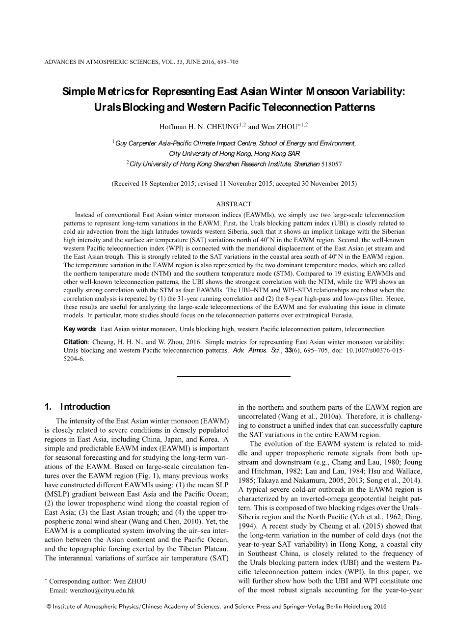 引用:Cheung,H. H. N.和W. Zhou,2016:表征东亚冬季季风变率的简单度量:乌拉尔地区阻塞和西太平洋遥相关型。Adv. Atmos. Sci., 33(6), 695-705, doi: 10.1007/s00376-015-5204-6.