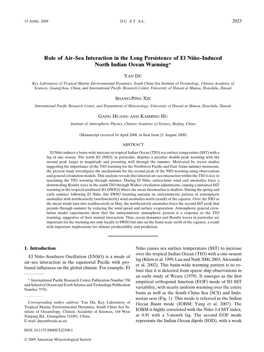 海气相互作用在厄尔尼诺激发的北印度洋增暖长期持续中的作用外文翻译资料