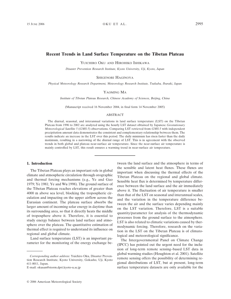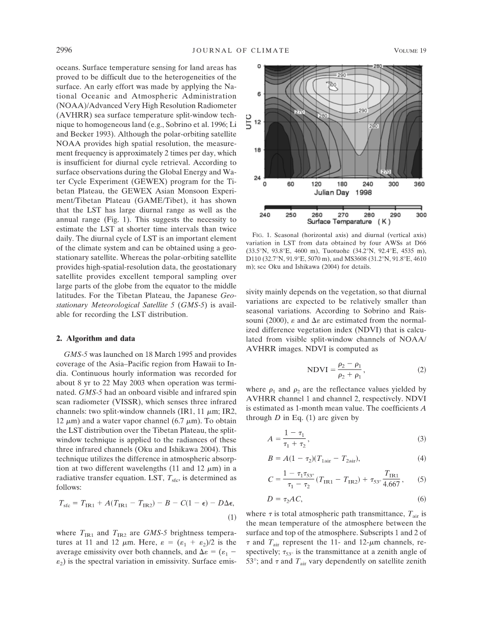 GMS-5卫星于1995年3月18日发射,它的覆盖范围是从夏威夷到印度的亚太地区。它持续记录了8年的逐小时信息,并于2003年5月22日停止使用。GMS-5有一个可见光和红外自旋扫描辐射计(VISSR),它可以检测三个红外通道:两个分裂窗口通道(IR1,11;IR2,12)和一个水汽通道(6.7)。为了获得青藏高原上的LST分布,我们将这种三维红外通道(Oku和Ishikawa 2004)的辐射率应用了分割窗技术(Oku and Ishikawa 2004)。这种技术利用了辐射传输方程中两个不同波长(11和12)的大气吸收差异。 LST,,被定义为如下: