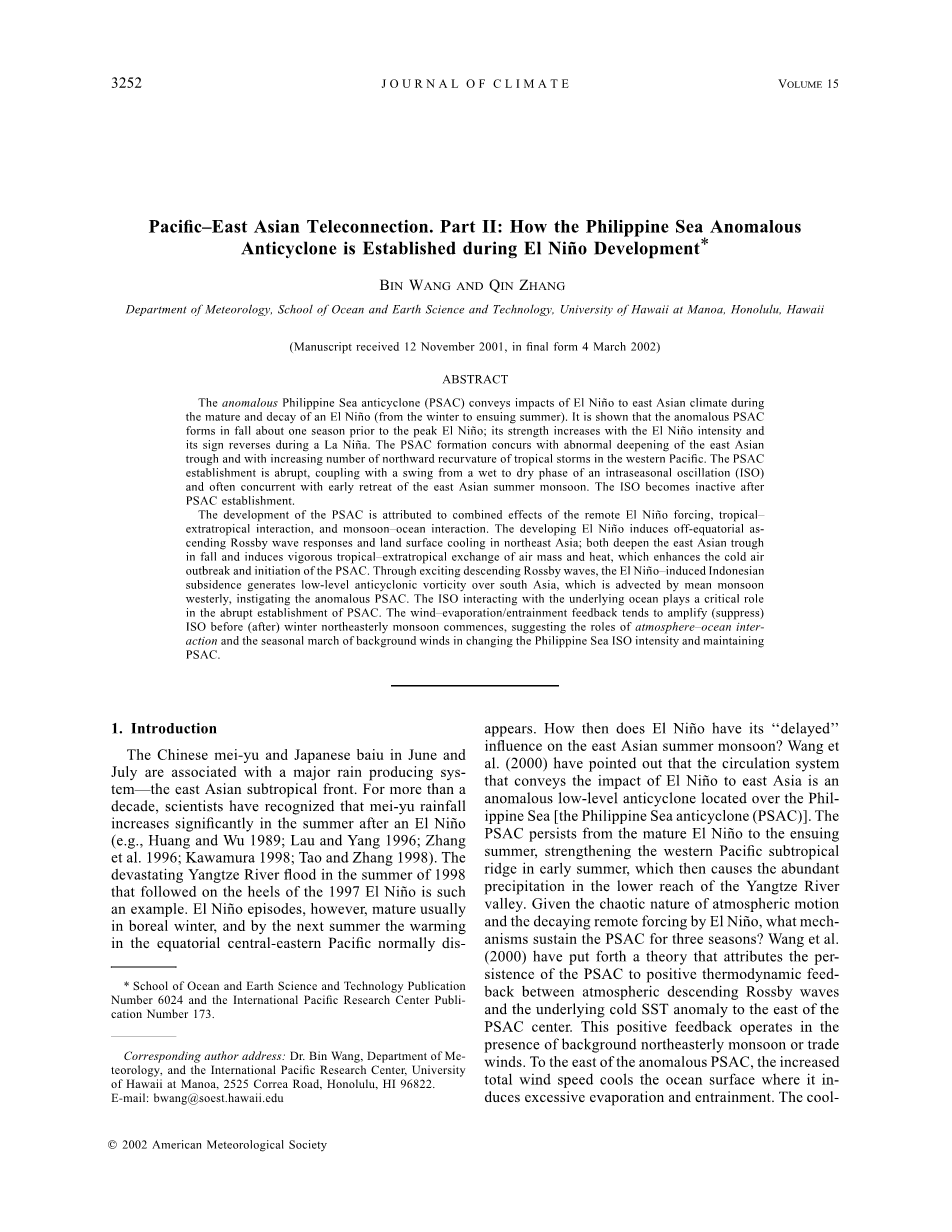 Wang等人(2000)的工作主要关注El Nino成熟和衰变阶段的遥相关。问题是(i)在El Nino发展期间何时以及如何建立PSAC,以及(ii)什么样的过程造成PSAC的形成。目前的工作是Wang等人(2000)的延续,旨在解决这些问题。为此,我们的分析着重于El Nino夏季和秋季发展阶段。