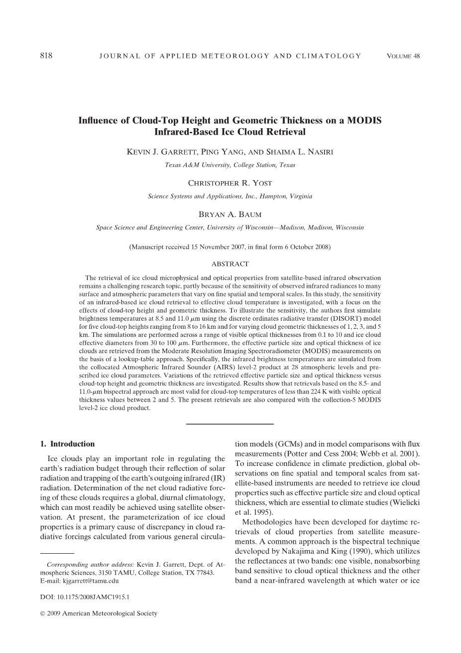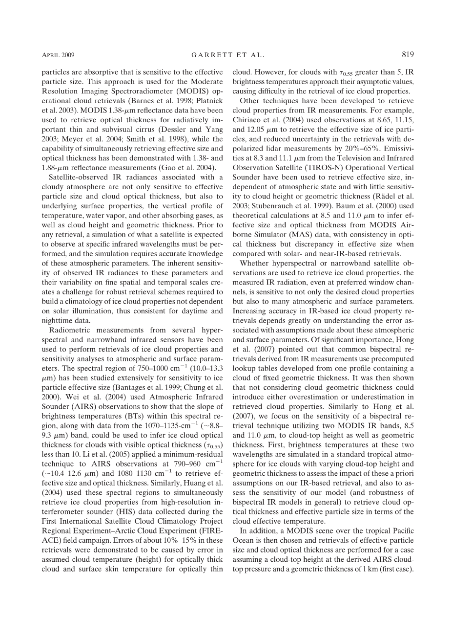从几个超光谱和窄带红外传感器辐射测量已被用于反演冰云性质和对于大气和地表参数的敏感性分析。750-1000cm21(10.0-13.3mm)的光谱区域已被广泛地用于对冰粒有效尺寸的敏感性的研究。(Bantages et al. 1999; Chung et al. 2000). Wei et al. (2004)使用大气红外探测器(AIRS)观察结果表明,该光谱区域内的亮度温度(BT)的斜率以及来自1070–1135-cm21 (;8.8– 9.3 mm)带的数据可用于推测具有冰云的可见光学厚度(t0.55)光学厚度小于10的云。Li et al(2005)对790-960 cm21(10.4-12.6 mm)和1080-1130 cm21的AIRS观测应用了最小残差技术,以获得有效的尺寸和光学厚度。同样地,黄等人 (2004)使用这些光谱区域,用高分辨率干涉测深仪(HIS)数据反演出冰云特性,数据来自于第一个国际卫星云气候项目区域实验 - 北极云实验(FIREACE)。 这些反演中约10%-15%的误差被证明是由于光学厚度云的假定云温度(高度)和光学薄云的表面温度的误差引起的。 然而,对于t0.55大于5的云,红外亮度温度接近其近似值,导致冰云属性的反演的困难。