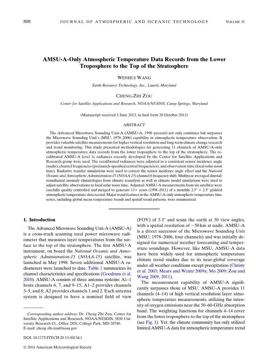摘要 先进的微波探测单元A(AMSU-A,1998年至今)维持并超越了微波探测单元(MSU,1978-2006)的大气温度观测能力,它正为更高的垂直分辨率和长期气候变化研究和趋势监测提供着有价值的卫星观测资料。对于从对流层低层到平流层顶部的大气温度数据记录,本研究共提出了11个产生AMSU-A通道的方法,并使用了卫星应用和研究小组最近开发的重新校准的AMSU-A 1c级辐射办法——将重新校准后的辐射率调整为一致的传感器入射角(天底),信道频率(发射预指定的中心频率)和观测时间(当地太阳午间时间),并使用辐射传输模拟来校正传感器入射角效应和第15号国家海洋和大气管理局(NOAA-15)6频道中的频移。