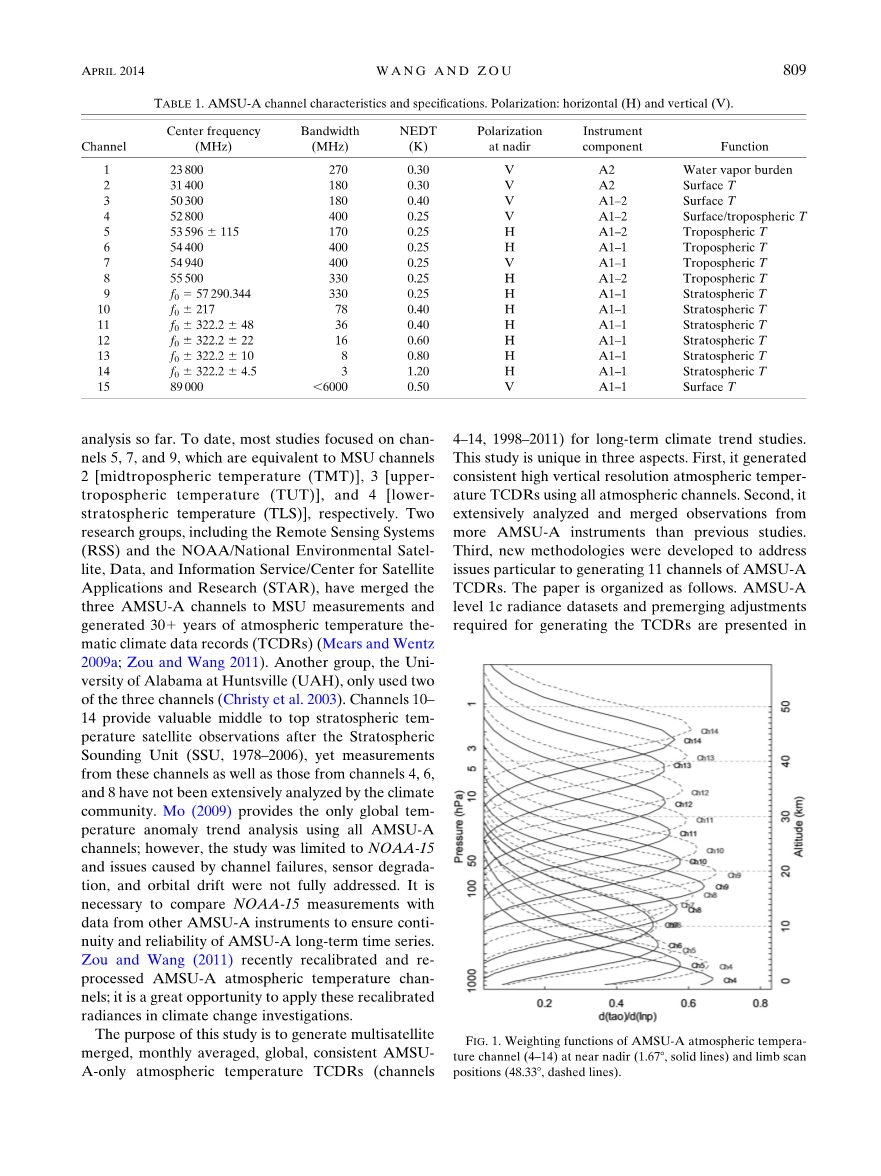 AMSU-A的观测能力远超MSU。它通过观测50-60 GHz吸收带附近的氧气排放强度,提供了11个高垂直分辨率大气各层温度测量的频道(4-14)。该频道利用加权函数,从而覆盖了整个对流层低层到平流层顶部(见图1)。然而,气候研究界至今仅利用有限的AMSU-A数据进行大气温度趋势分析。并且,大多数研究至今仍集中在频道5,7和9上,这些频道等同于MSU中的频道2 [中层气温(TMT)],频道3 [上对流层温度(TUT)]和频道4 [平流层低温 (TLS)]。包括遥感系统(RSS)和美国国家海洋和大气局/国家环境卫星,数据和信息服务/卫星应用与研究中心(STAR)在内的两个研究小组已将三个AMSU-A通道合并为了一组——它利用MSU测量和生成30年以上的大气温度的气候数据记录(TCDRs)(Mears和Wentz,2009;邹和王,2011)。而哈茨维尔阿拉巴马大学(UAH)的另一个研究组,只使用了这三个通道中的两个(Christy 等,2003)。通道10-14在平流层探测单元(SSU,1978-2006)之后提供了有价值的中高层平流层温度卫星观测资料,但来自这些通道以及来自通道4,6和8的测量结果尚未得到气候界的广泛分析。Mo(2009)利用了所有的AMSU-A通道提供了唯一一份全球温度异常趋势分析研究;然而,由于通道故障、传感器衰减以及轨道漂移引起的问题尚未得到完全解决,这项研究仅限于NOAA-15。所以,有必要将NOAA-15的测量结果与其他AMSU-A仪器的数据进行比较,以确保AMSU-A在今后长期时间内的连续性和可靠性。而邹和王(2011)最近正在重新校准和处理AMSU-A的大气温度通道——这正是将这些重新校准后的辐射率用于气候变化研究的好机会。