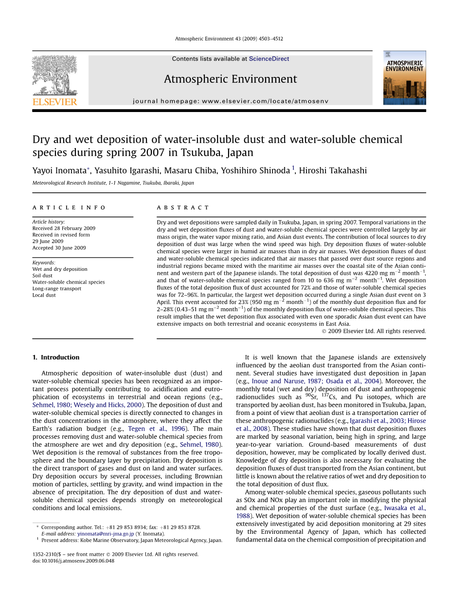 干湿沉降于2007年春天在日本筑波被采样。灰尘和水溶性化学物种的干湿沉降通量在时间变化上很大程度上受到空气质量起源,水汽混合比和亚洲沙尘事件的控制。当风速较高时,当地来源对灰尘的干沉降所作的贡献是很大的。水溶性化学物种的干沉降通量在潮湿气团中比在干冷气团中大。灰尘和水溶性化学物种的湿沉降通量表示经过粉尘源区和工业地区的气团开始和亚洲大陆的沿海站点和日本群岛上空的海洋性气团混合。总的灰尘的沉降量为每个月 4220 毫克每平方米,水溶性化学物种的沉降量为每个月10 -636 毫克每平方米。湿沉降通量在总沉降通量占72%,它在水溶性化学物种中占据72%-96%。特别的是,最大的湿沉降发生在3日亚洲沙尘事件期间。此事件占每月尘埃沉降通量的 23%(每个月950 毫克每平方米) 和占每月水溶性化学物种沉降通量的2-28%(每个月0.43-51 毫克每平方米),这一结果意味着与偶然发生的亚洲沙尘事件有关联的湿沉降通量对东亚地区的陆地和海洋生态系统有着广泛的影响。