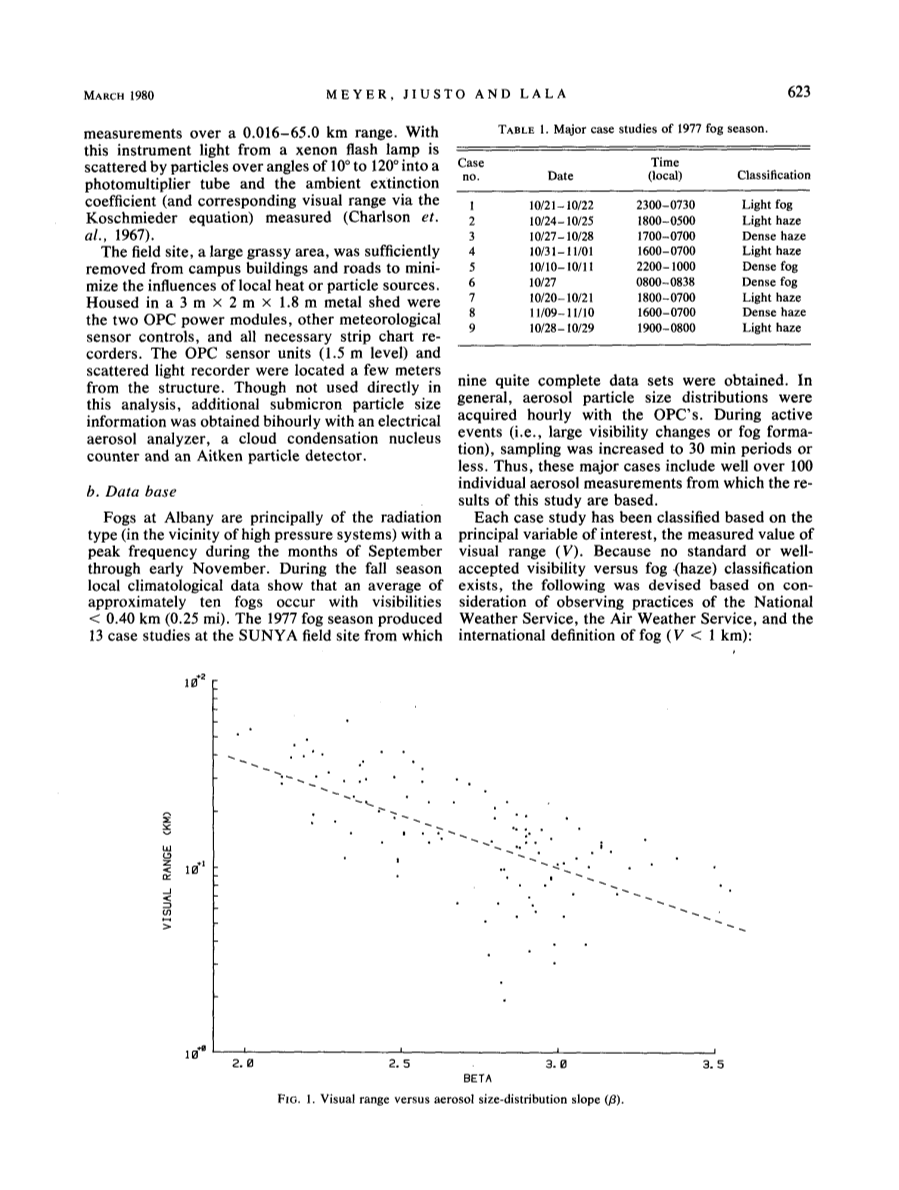 1977年秋季,在奥尔巴尼纽约州立大学的主校区进行了一次调查辐射霾、雾过程中能见度和液滴尺度谱的项目。同样进行了描述边界层特征的许多变量和数字雾模型性能的研究,但没有做报告。这次研究的主要目标在这里做一表述:1)测量美国东北部(Albany,New York)辐射霾、雾过程中典型颗粒物(液滴)尺度分布;2)把能见度的变化和气溶胶尺度谱特征、相对湿度联系起来。