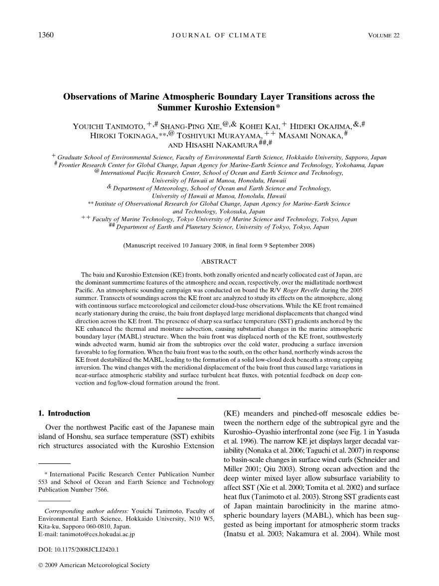 几乎平行分布在日本东部的梅雨锋和黑潮延伸体锋区是中纬度西北太平洋地区大气和海洋夏季主要的特征。罗杰bull;雷维尔在2005年的夏天进行了一项船上大气探测活动,通过连续的地表气象观测和岩石测量云基观测,探究黑潮延伸体横截面对大气的影响。在巡航期间,当黑潮延伸面几乎保持静止时,梅雨锋面显示出通过黑潮延伸面时经向风发生了极大的改变。较大的海表面温度(SST)梯度的存在使强热湿平流增强,导致海气边界层结构的变化。当梅雨锋移动到黑潮延伸体北面时,西南平流增暖、亚热带地区潮湿的空气覆盖在寒冷的水面上,产生表面对流,有利于雾的形成。另一方面,当梅雨锋南移的时候,偏北风在通过黑潮延伸体的时候破坏了边界层的稳定性,在强大的逆温层下形成一个固体的低云。梅雨锋南北移动以及风的变化会导致近地面大气稳定性和湍流热通量发生巨大的变化,从而与深对流和雾/低云形成潜在的反馈。