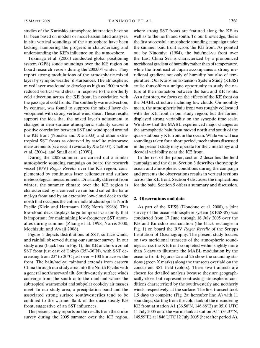 在这部分(多诺霍等人2008),一个从2005年的6月17到7月16由斯克里普斯大学海洋研究所的罗杰·雷维尔在考察船上做的关于黑潮和黑潮再循环的一项海洋和大气系统的联合调查 。目前的研究主要集中在通过KE面大气探测到的在两子午断面完成要超过三天表明由海洋锋影响边界层。图2a和2b显示探空站(绿色的X标记)沿断面覆盖在同期海温场(颜色)。通过对这两个断面进行详细分析得出,他们在地理上接近但却代表以西南风和偏北风以及地面风为主要特征的大气条件。第一样花了1.5天完成(图2A;此后线)11次探测,从2005年7月11日05时10分 UTC 开始的蜿蜒的KE面的冷侧站A1到结束于2005年7月12日18时46分UTCD的温一侧的A11站(34.378n,145.998e)。第二张图是由六个GPS探空组成从2005年7月13日7时41分在KE面 暖的一侧B1站开始半天后线A的西侧到2005年7月14日7时33分结束的冷侧站B6。