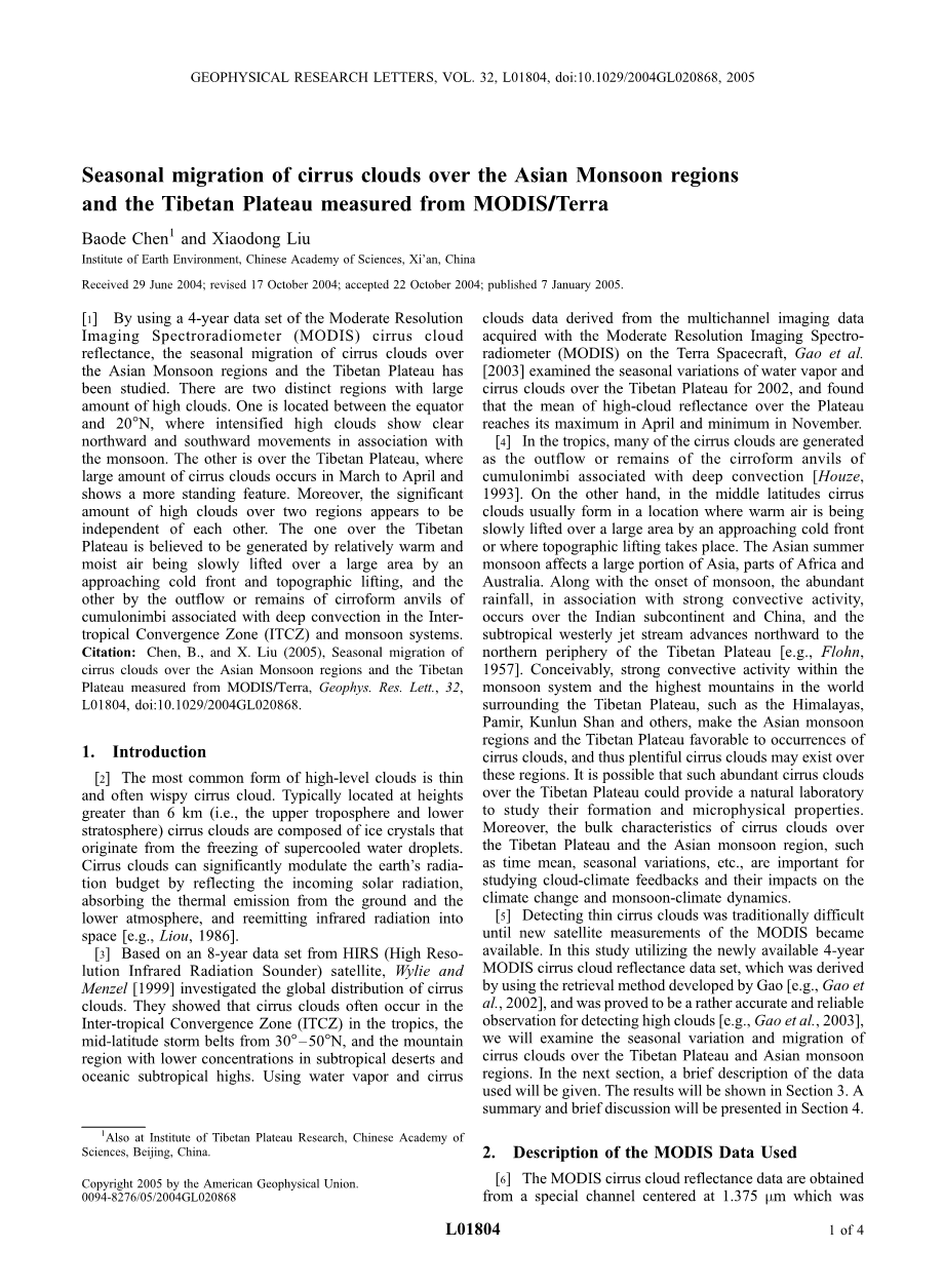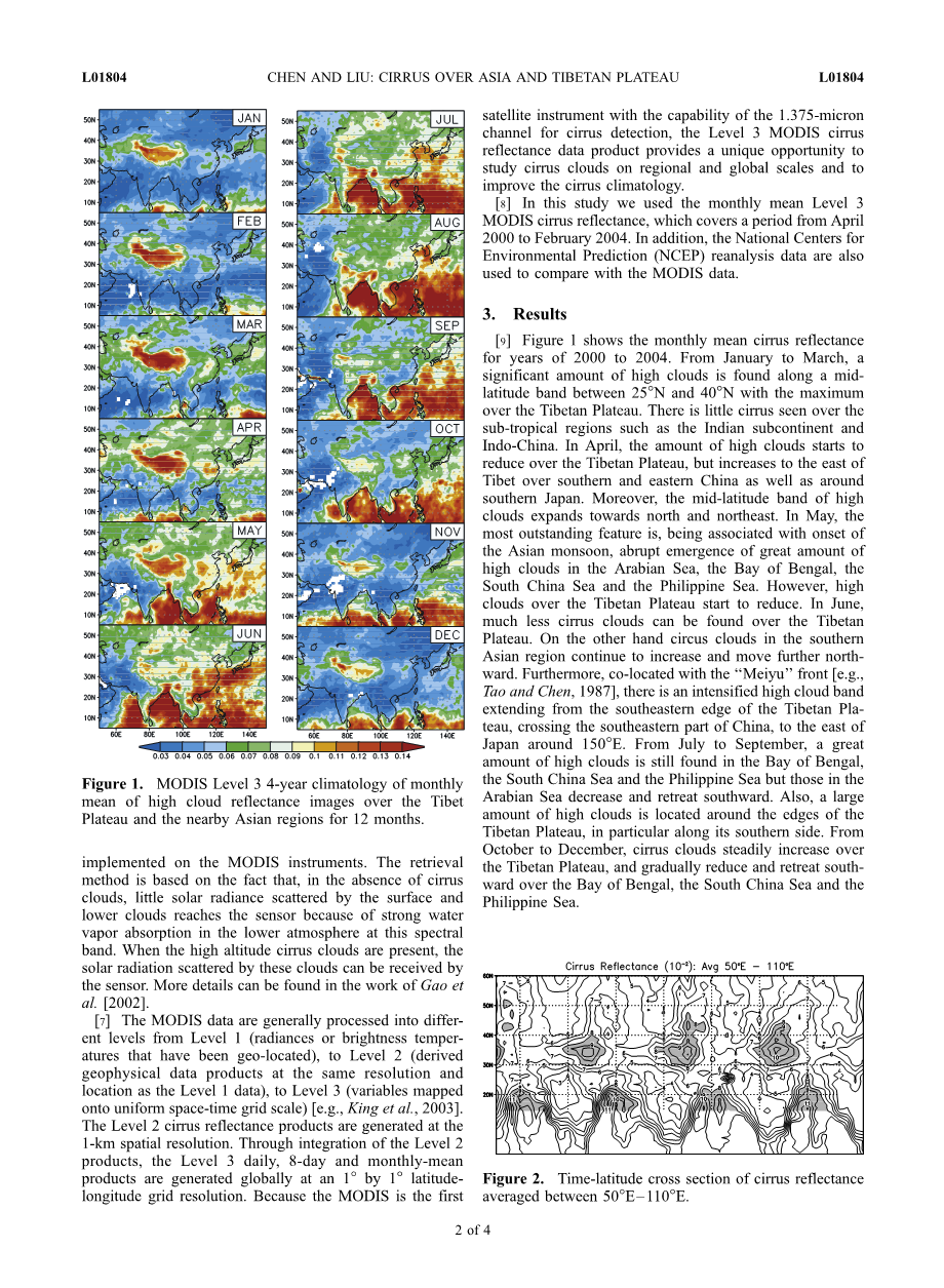 检测薄卷云传统上是困难的,直到新的卫星测量的MODIS出现。在本研究中利用近期可用的4年MODIS卷云数据集,这是通过使用由Gao开发的检索方法,这种方法被证明是一个相当准确和可靠的观测和探测高云的方法,我们将研究卷云在青藏高原和亚洲季风地区的季节变化和迁移。在下一节中,将给出所使用的数据的简要描述。结果将在第3节中显示。总结和简要讨论将在第4节中介绍。