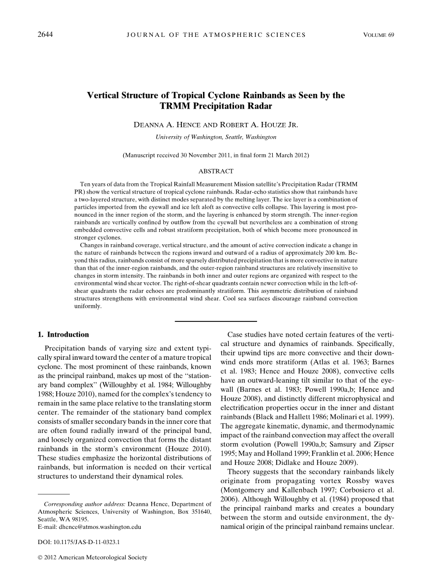 TRMM PR十年的观测数据向我们展示了热带气旋雨带的垂直结构,雨带有两层结构,融化层把它们不同的模式。冰层的粒子从眼墙进入,当对流单体消亡时从高层流出。这种分层在风暴内部区域最明显,随着风暴的增强而增强。眼墙的流出物限制内部雨带的垂直结构,但任然是强的嵌入式对流单体和强盛的层状降水,使得气旋更加强大。