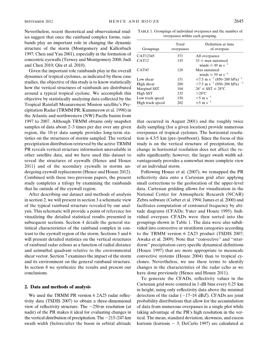 随着Houze等人 (2007)的研究,我们重新映射降水雷达反射率高层地理数据经过小修改后应用到笛卡尔坐标中。可使用的数据可以来自国家气候中心斑马软件Corbet 等人1994; James 等人2000),便于通过高度图计算波状外形的频率(CFADs;Yuter和Houze 1995)。CAFDs个体数据如表一所示。这些数据根据TMMM 6 2A25版本的产分为对流和层状类。值得注意的是对流类和层状类的动态定义(Houze 1997)更适合中小尺(Houze 2004)度而不是热带气旋。然而,我们用来识别雷达回波特征的做法跟以前一样(Hence 和Houze 2011).