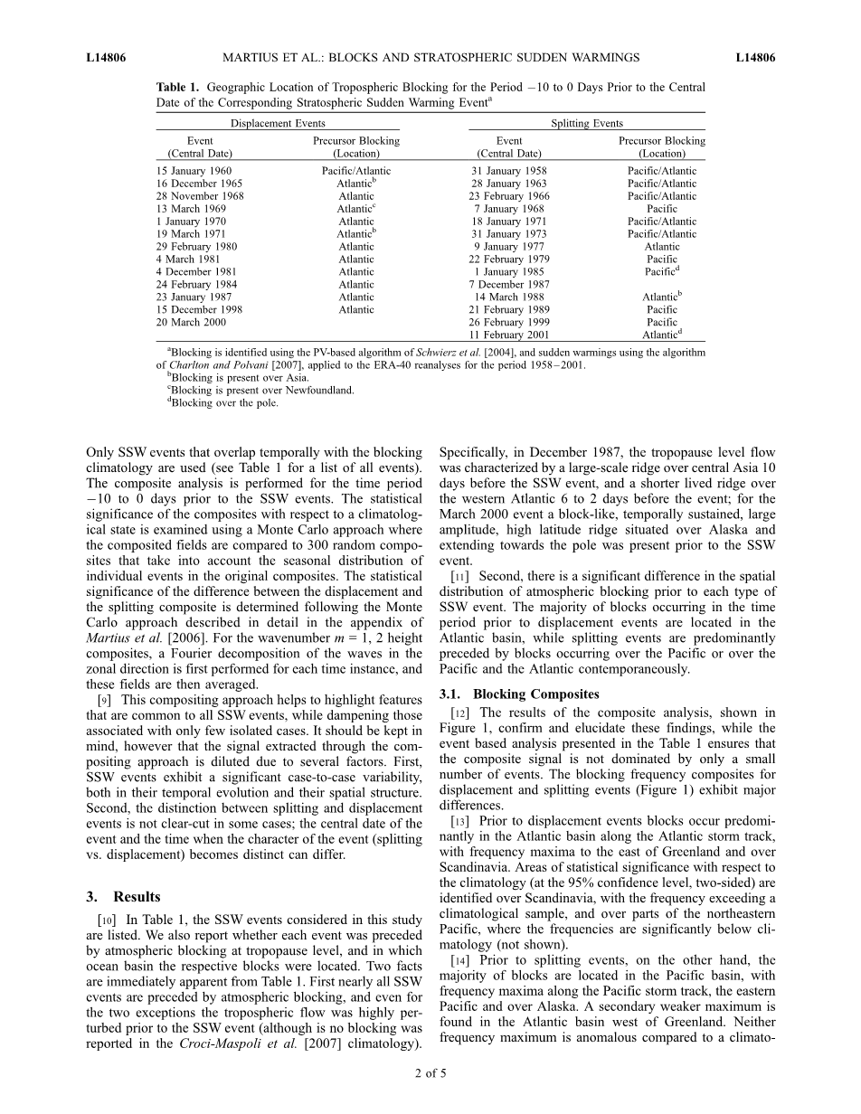 表1列出了在本次研究中使用到的SSW事件,我们还列出了是否在每一个事件之前都有对流层顶的大气阻塞,以及各个阻塞都是位于哪一个地区的。从表1中我们可以得出两个事实。第一,几乎所有的SSW事件之前都有大气阻塞高压发生,对于两个例外事件,对流层气流在SSW事件之前受到了剧烈的扰动(虽然Croci-Maspoli等人(2007)认为并没有阻塞)。尤其是在1987年12月对流层顶气流的特征是:在SSW事件发生的10天前中亚地区就有一个大型脊,在SSW事件发生前的6到2天,西大西洋有一个短期脊;在2000年3月的SSW事件发生之前,阿拉斯加地区有一个类似阻塞的短暂的大型高纬度脊,并且一直延伸至北极。