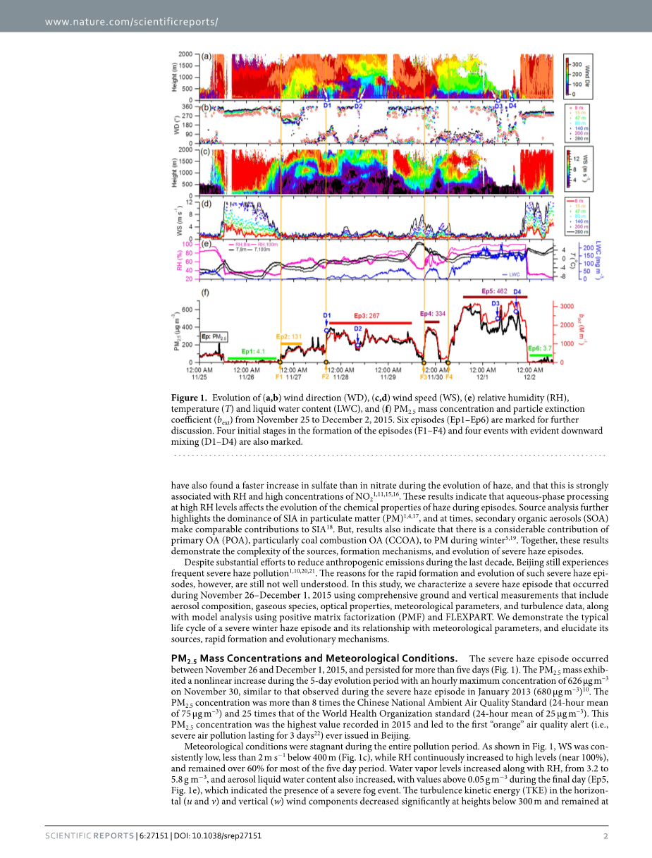 图1所示。2015年11月25日- 12月2日(a,b)风向(WD)、风速(c,d)、相对湿度(RH)、温度(T)、液化水含量(LWC)、PM2.5质量浓度及粒子消光系数(bext)的演变。六个阶段(Ep1-Ep6)作进一步讨论。还标记了事件形成的四个初始阶段(F1-F4)和四个明显向下混合的事件(D1-D4)