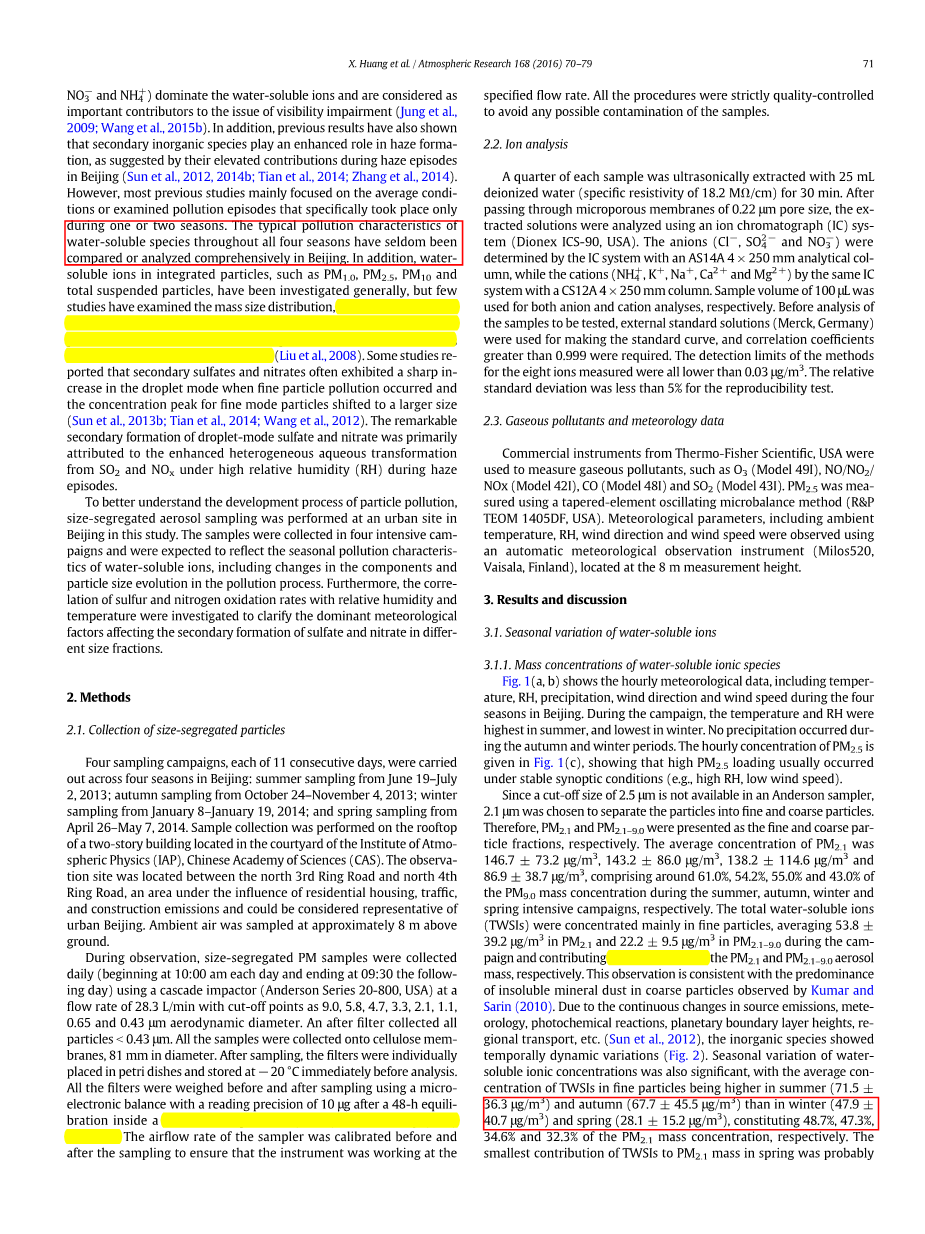雾霾污染的特征是细颗粒物含量增加,这对可见度,辐射强迫以及酸和营养物质向生态系统的沉积具有重要影响[29,39]。细颗粒的散射效应是影响能见度的最重要因素; 大气气溶胶的散射系数已被证明占北京及周边地区超过85%的消光系数[36,48,59]。同时,由于微粒能深入肺部,导致对心肺系统产生不利影响,因此,人体健康问题也源于微粒物质[21]。颗粒物质(PM)是源自天然和人为来源的各种化学物质(例如,水溶性无机离子,有机物质,黑碳和地壳物质)的混合物[25]。水溶性无机物是PM的主要成分,占细颗粒的三分之一或更多[15,59]。在北京的许多研究中已经对水溶性离子进行了系统分析。据观察发现,二次无机离子(SO42-,NO3-和NH )在水溶性离子中占主导地位,被认为是影响能见度受损问题的重要因素[14,46]。此外,之前的研究结果还表明,二次无机物质在雾霾形成中发挥着更强的作用,正如它们在北京雾霾发生期间所起的作用一样。[27,31,37,56]。然而,大多数以前的研究主要集中在平均情况或特定的污染事件发生在一个或两个季节。而典型的污染特征在北京市四季水溶性物种很少进行比较和综合分析。 此外,对PM1.0、PM2.5、PM10和总悬浮颗粒中的水溶性离子进行了广泛的研究,但很少有关于其质量分布的研究,这会严重影响到PM的光学特性[6,35],并且可以提供有关颗粒形成,转化,运输和清除过程[17]。一些研究表明,当细颗粒污染发生时,二次硫酸盐和硝酸盐通常在液滴模态中表现出急剧增加,并且细粒径颗粒的浓度峰值转移到更大的尺寸[29,37,41]。液滴模态硫酸盐和硝酸盐的显著二次形成主要是由于在相对湿度(RH)较高的情况下,在雾霾发作期间,二氧化硫和氮氧化物的非均相水相转变的增强。