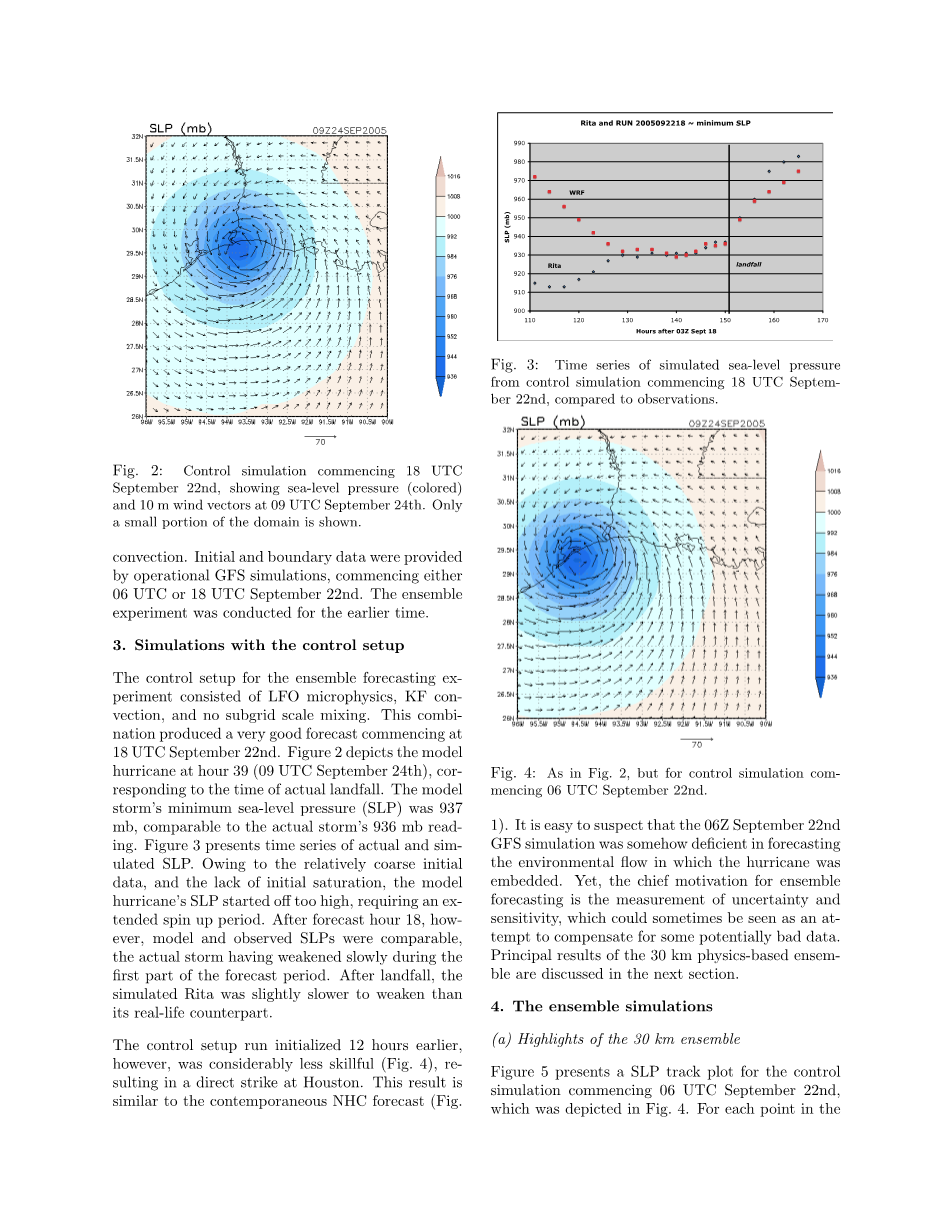 集合预报实验的控制设置包括LFO微物理学,KF对流,无次网格尺度混合。这个组合生产了一个前所未有的命令。图2显示了飓风在39时的状态(09 UTC 9月24日),相当于实际登陆时间。模拟风暴的最小海平面气压(SLP)为937 mb,与实际风暴的936 mb读数相当。图3给出了实际和模拟SLP的时间序列。由于初始数据比较粗糙,初始饱和度不足,模拟飓风的发生频率太高,需要延长时间。然而,18小时后的预测,模型和观测到的SLP是相近的,但实际风暴在预测期的第一部分缓慢减弱。登陆后,模拟的“丽塔”比现实的飓风慢一些。