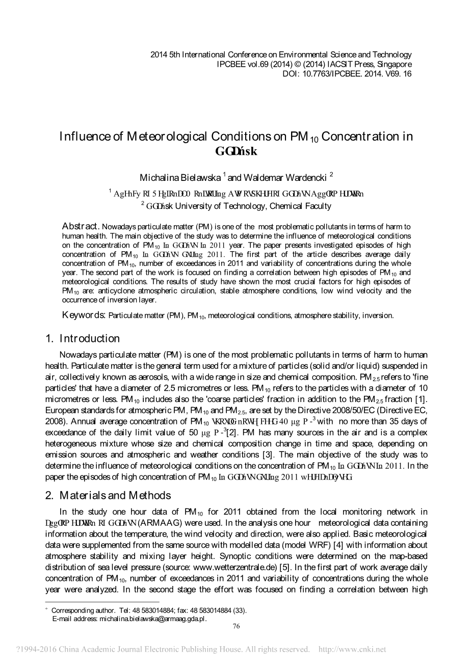 理论上,目前颗粒物(PM)是对人类健康危害最大的污染物之一。研究的主要目的是确定气象条件对于2011年格但斯克PM10浓度的影响。本文介绍了2011年格但斯克高浓度PM10的调查情况。文章第一部分介绍了PM10的平均日浓度,2011年的超标次数和全年的浓度变化。第二部分工作集中在找出PM10的高发和气象条件之间的相关性。研究结果表明,PM10高发最重要的因素是:反气旋大气环流,大气条件稳定,风速低,反演层的发生。