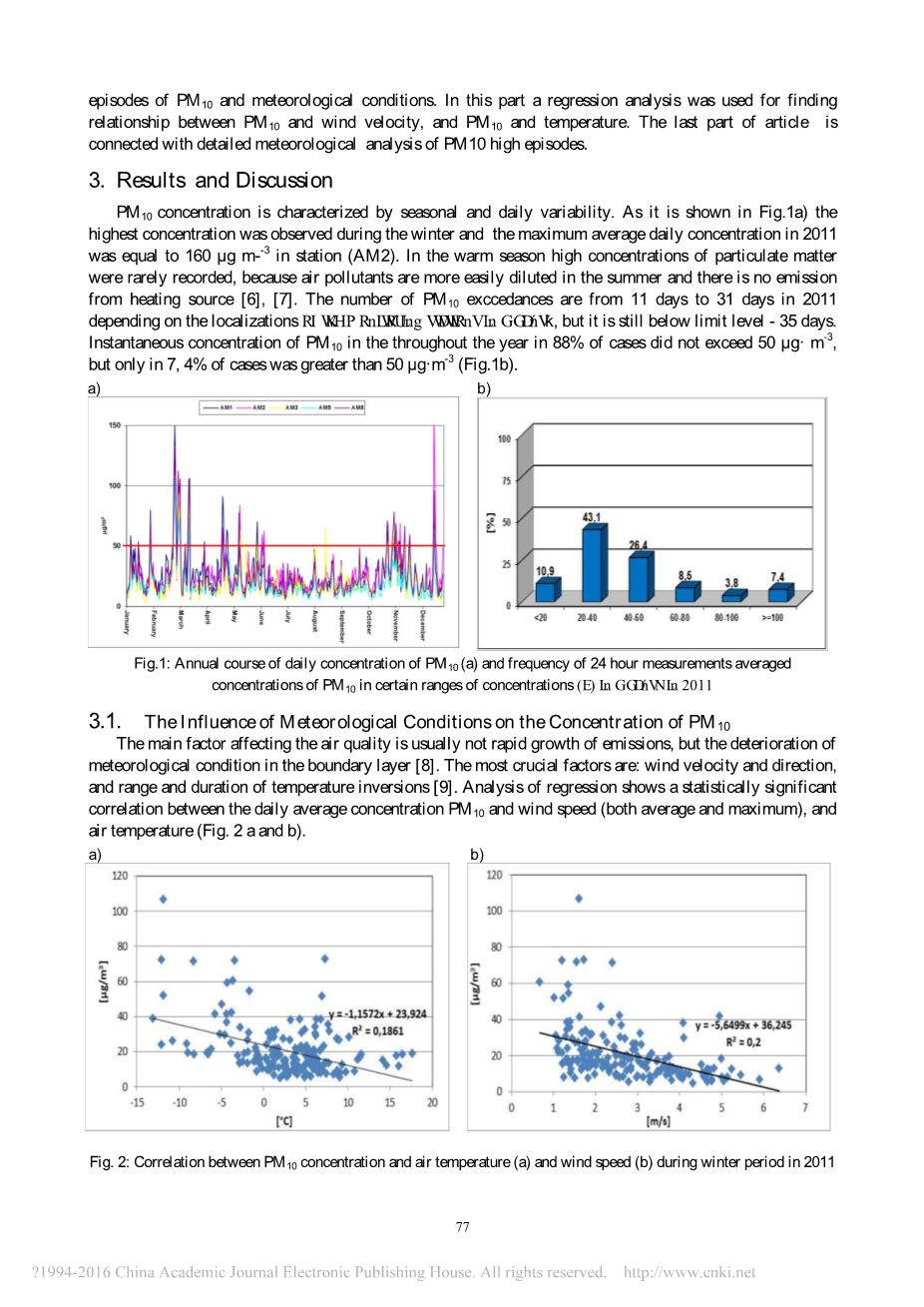 在研究中,使用了从格但斯克集团(ARMAAG)的地方监测网络获得的PM10 2011年1小时数据。在分析的一小时气象数据中,还包含有关温度,风速和风向的信息。基本气象资料用相同的来源补充模型数据(模型WRF)[4],其中包括大气稳定性和混合层高度的信息。天气条件是基于地图分布的海平面压力确定的(来源:www.wetterzentrale.de)[5]。PM10工作日均浓度的第一部分,对2011年超标次数和全年浓度变化情况进行了分析。在第二阶段,努力的重点是找出PM10的高发和气象条件之间的相关性。在这一部分,使用回归分析来找出PM10与风速之间的关系,PM10和温度。文章的最后一部分与PM10高发的详细气象分析有关。