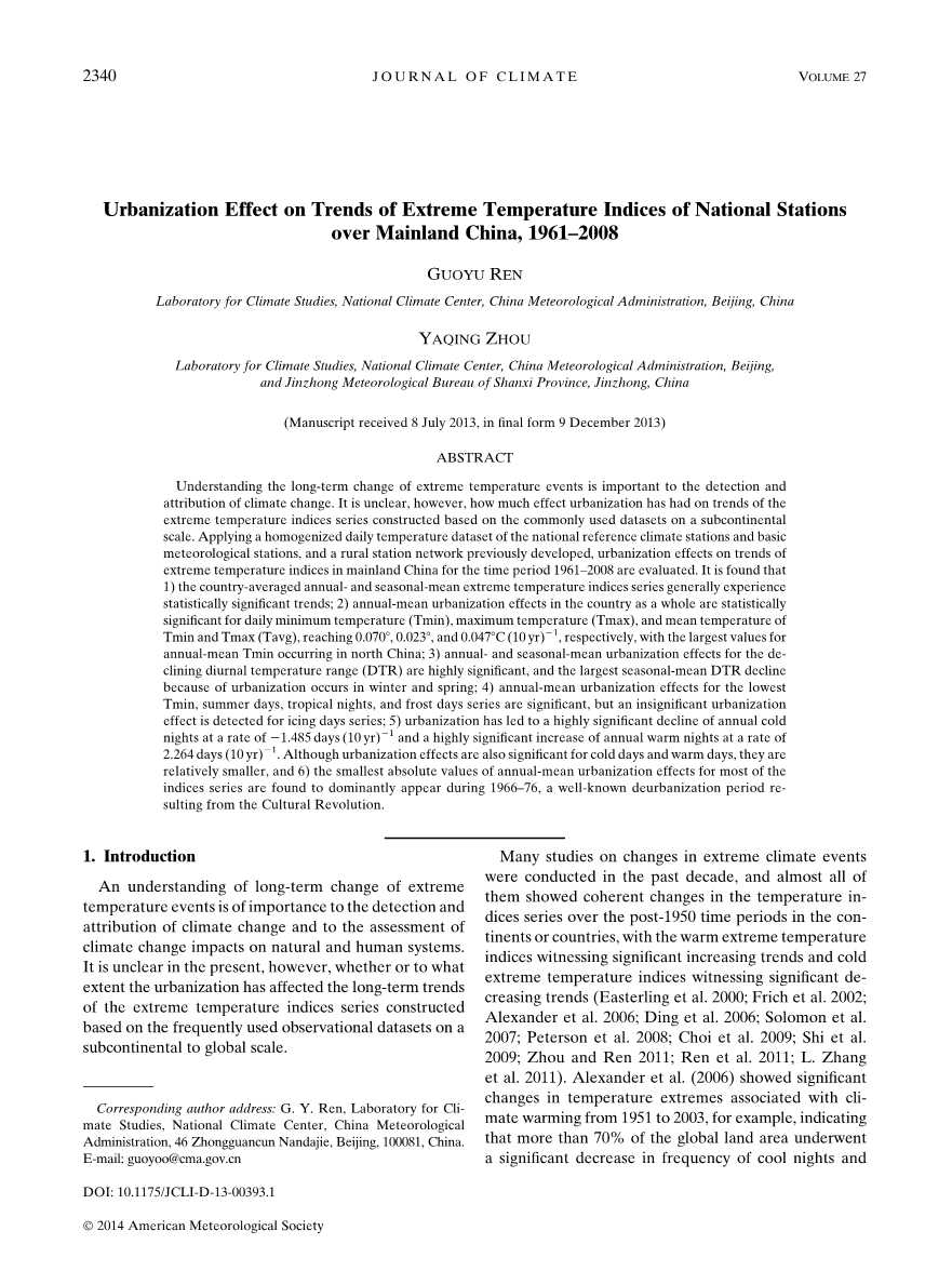 但是,目前还不清楚快速城市化,特别是UHI增加的幅度对中国大陆RCBMS极端温度指数序列的长期趋势有多大影响。RCBMS数据集经常被中国研究人员用于分析平均和极端气候的长期变化(Ren等2008,2012),并且在城市化对中国大陆区域年平均和季节平均温度序列趋势的影响已经得到了很好的理解后,最好能确定城市化贡献的性质和程度。在本文中,我们应用了同质性调整的日常温度数据集和参考先前由Ren等(2010b)开发的SAT网络来评估城市化对中国大陆极端温度指数趋势的影响。我们的调查显示,全国各地的城市化影响同样显著,尽管其影响程度略小于华北地区。