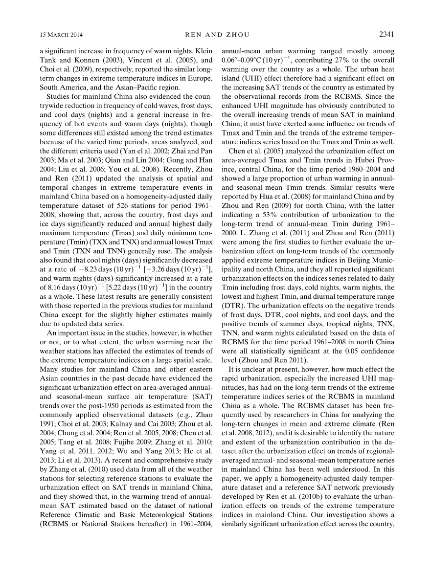 然而,研究中的一个重要问题是气象站附近的城市变暖是否或在多大程度上影响了大空间尺度上极端温度指数趋势的估计。过去十年中对中国大陆和其他东亚国家的许多研究表明,从普遍应用的观测资料估计(例如,Zhao 1991; Choi等2003; Kalnay和Cai 2003; Zhou等2004; Chung等2004; Ren等2005,2008; Chen等2005; Tang等2008; Fujibe 2009; Zhang等2010; Yang等2011,2012; Wu and Yang 2013; He等2013; Li 等2013),1950年后时期的平均区域年均和季节平均地面气温(SAT)趋势具有显著的城市化效应。 Zhang等(2010)最近的研究综合利用所有气象站的数据选择参考站来评估城市化对中国大陆SAT趋势的影响,他们表明,在基于国家参考气候数据集估算的年均SAT变暖趋势中1961年至2004年,基本气象站(RCBMS或国家站)所在城市年均变暖大多在每10年0.068-0.098℃之间,占全国整体变暖的27%。因此,根据RCBMS的观测记录估计,城市热岛(UHI)效应对该国不断增加的SAT趋势产生了显著影响。由于增强的UHI幅度明显促成了中国大陆平均SAT的整体增长趋势,它必然会对Tmax和Tmin的趋势以及基于Tmax和Tmin的极端温度指数序列的趋势产生一些影响。