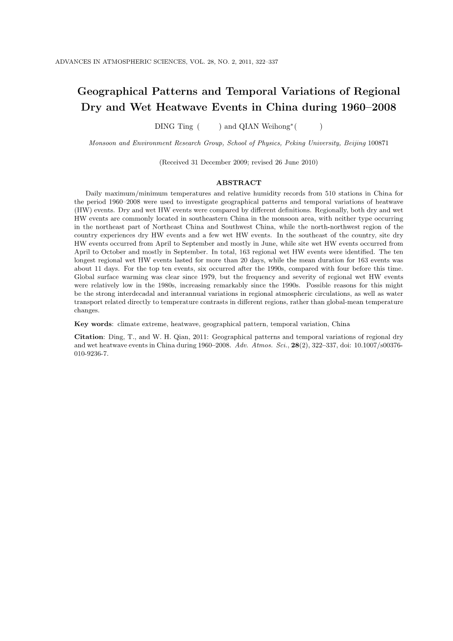 关键词:气候极端、热浪、地理格局、时间变化、中国