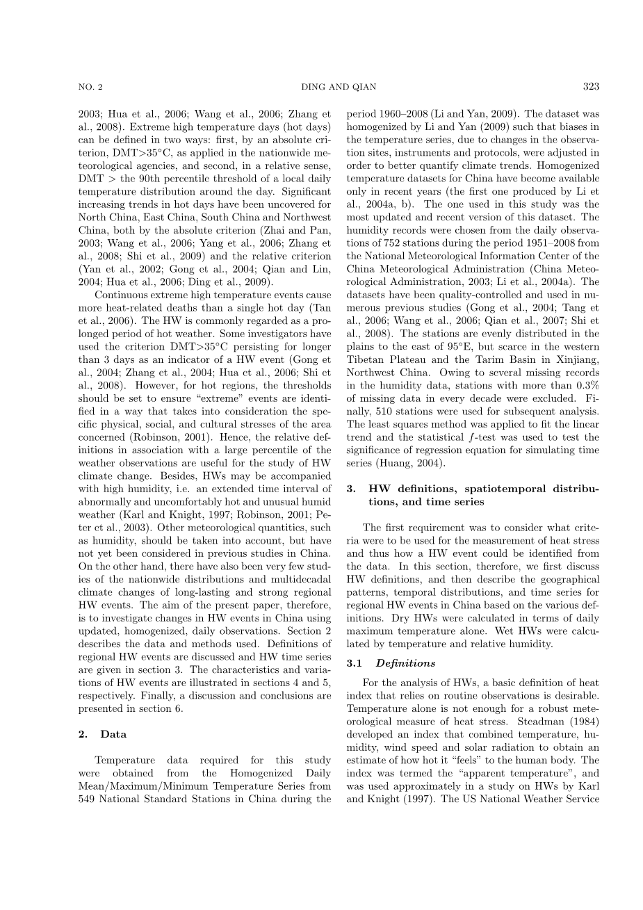 持续的极端高温事件导致更多的热相关死亡,而不是一个炎热的一天(Tan 等人,2006)。HW通常被认为是长时间的热天气。一些调查人员使用标准DMT gt; 35 ℃持续时间超过3天作为HW事件的指标(Gong 等人,2004;Zhang 等人,2004;Hua等人,2006;施正荣等人,2008)。然而,对于热点地区,应该设置阈值以确保极端事件的确定,以考虑到有关地区的具体的物理、社会和文化压力(Robinson, 2001)。因此,与天气观测值的较大百分比关联的相关定义对于研究HW气候变化是有用的。此外,HWs可能伴有高湿度,即一段时间间隔不正常且不舒服的湿热天气(Karl和Knight, 1997;罗宾逊,2001;彼得等人,2003)。其他的气象量,如湿度,应该考虑在内,但在中国以前的研究中还没有考虑过。另一方面,也很少有关于长期和强烈的区域性的气候变化的全国性分布和多十年气候变化的研究。因此,本文的目的是通过更新的、均质化的日常观察来研究中国HW事件的变化。第2部分描述了所使用的数据和方法。讨论了区域HW事件的定义,并在第三节给出了HW时间序列。第4和第5节分别介绍了HW事件的特点和变化。最后,讨论和结论在第6部分中给出。