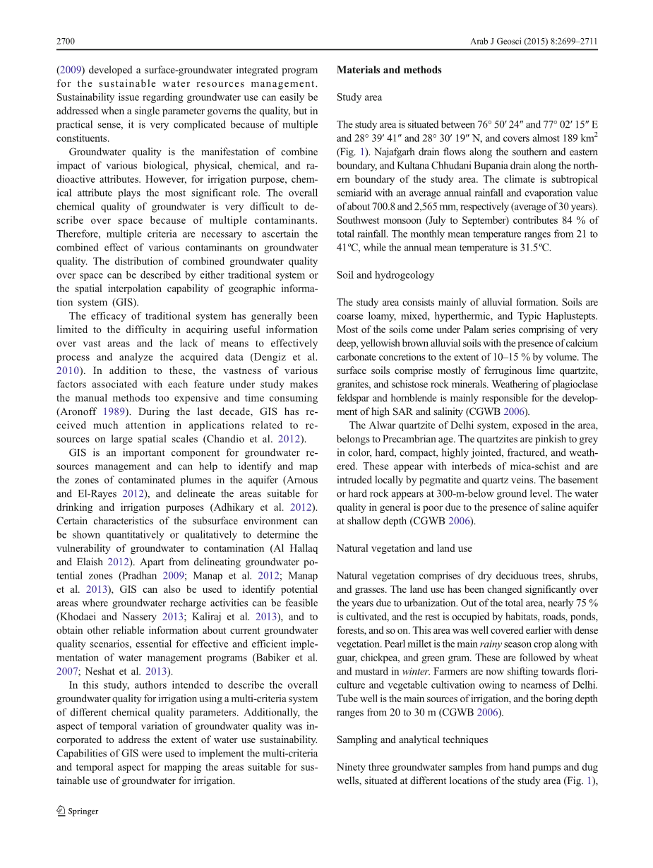 研究区位于76°5024“和77°0215”Eand28°3941“和28°3019”N之间,覆盖近189km2(图1)。 Najafgarh排水沿南部和东部边界流动,Kultana Chhudani Bupania沿研究区的北边界流失。气候为亚热带气候,年平均降水量和蒸发值分别约为700.8和2565毫米(平均30年)。西南季风(7月至9月)提供了总降雨量的84%。月平均气温21〜41℃,年平均气温31.5℃。