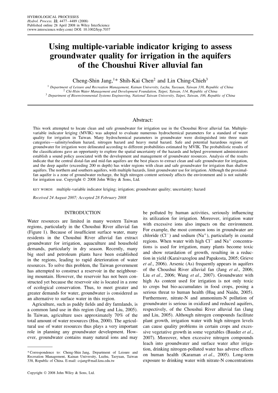 摘要:这项工作试图在周水河冲积扇为灌溉定位清洁安全的地下水。采用多指标Kriging(MVIK)评价台湾地区灌溉水质标准的多种水化学参数。地下水中的许多水化学参数被划分为三大类:盐度/钠危害、氮危害以及重金属危害。根据MVIK估计的不同概率,划分了地下水灌溉安全和潜在危险区。这些分类的概率结果提供了一个机会来探讨这些危险的空间不确定性,并帮助政府行政人员制定了一项与地下水资源的开发和管理有关的健全的政策。分析结果表明,中央远扇和中扇含水层是提供清洁、安全的地下水灌溉的最佳场所,深层含水层(深度超过200 m)有比浅层含水层更清洁和安全的地下水灌溉区域。北部和南部含水层具有多重危害,限制了地下水的灌溉用途。 虽然近扇含水层是地下水补给区,但高氮含量严重影响了环境,不适合灌溉使用。版权所有:2008年约翰·威利有限公司