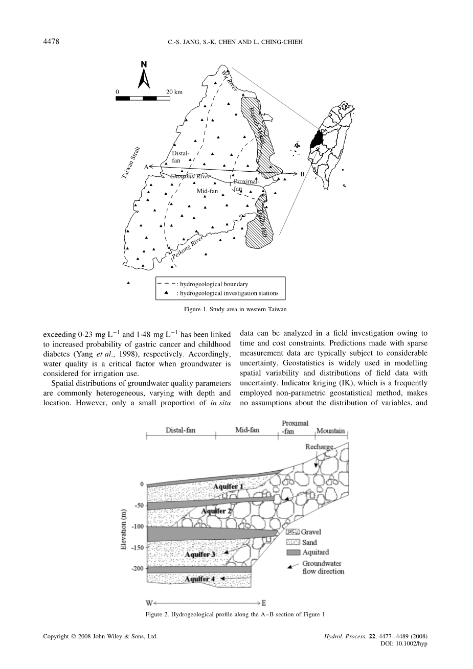 农业,如稻田和旱田,是这个地区常见的土地用途(张和刘,2005)。在台湾,农业约占水资源总量的70%(徐光裕,2000年)。因此,农业利用水资源在规划地下水开发中起着非常重要的作用。然而,地下水中含有许多天然离子,可能受到人类活动的污染,严重影响了地下水的灌溉利用。此外,过量的离子灌溉水也会对环境产生影响。例如,地下水中最常见的离子是氯化物(Cl)和钠(NAC),特别是在沿海地区。当使用高浓度氯和钠的水灌溉时,许多植物会中毒,并且生长迟缓,导致产量下降(Karaivazoglou和Papakosta,2005年;Grieve等人,2006年)。砷经常出现在周水河冲积扇含水层中(张等人,2006年;刘等人,2006年;王等人,2007年)。用于灌溉的高含量地下水不仅对作物有毒,而且对粮食作物中的生物积累造成严重威胁(Huq和Naidu,2005年)。 此外,在周水河冲积扇的氧化含水层和还原含水层中,地下水的硝态氮和铵态氮污染严重(张和刘,2005)。虽然氮化合物促进植物生长,但高氮水平的灌溉水会造成某些作物的质量问题和某些蔬菜的过度营养生长(Bauder等人,2007年)。此外,当过量的氮化合物在灌溉后渗入地下水和地表水时,氮污染的饮用水会对人类健康产生不利影响(Karaman等人,2005年)。长期接触硝酸盐氮浓度超过0.23毫克每升及1.48毫克每升的饮用水分别与胃癌和儿童期糖尿病的发病率增加有关(杨等人,1998)。因此,在考虑地下水灌溉用途时,水质是一个关键因素。