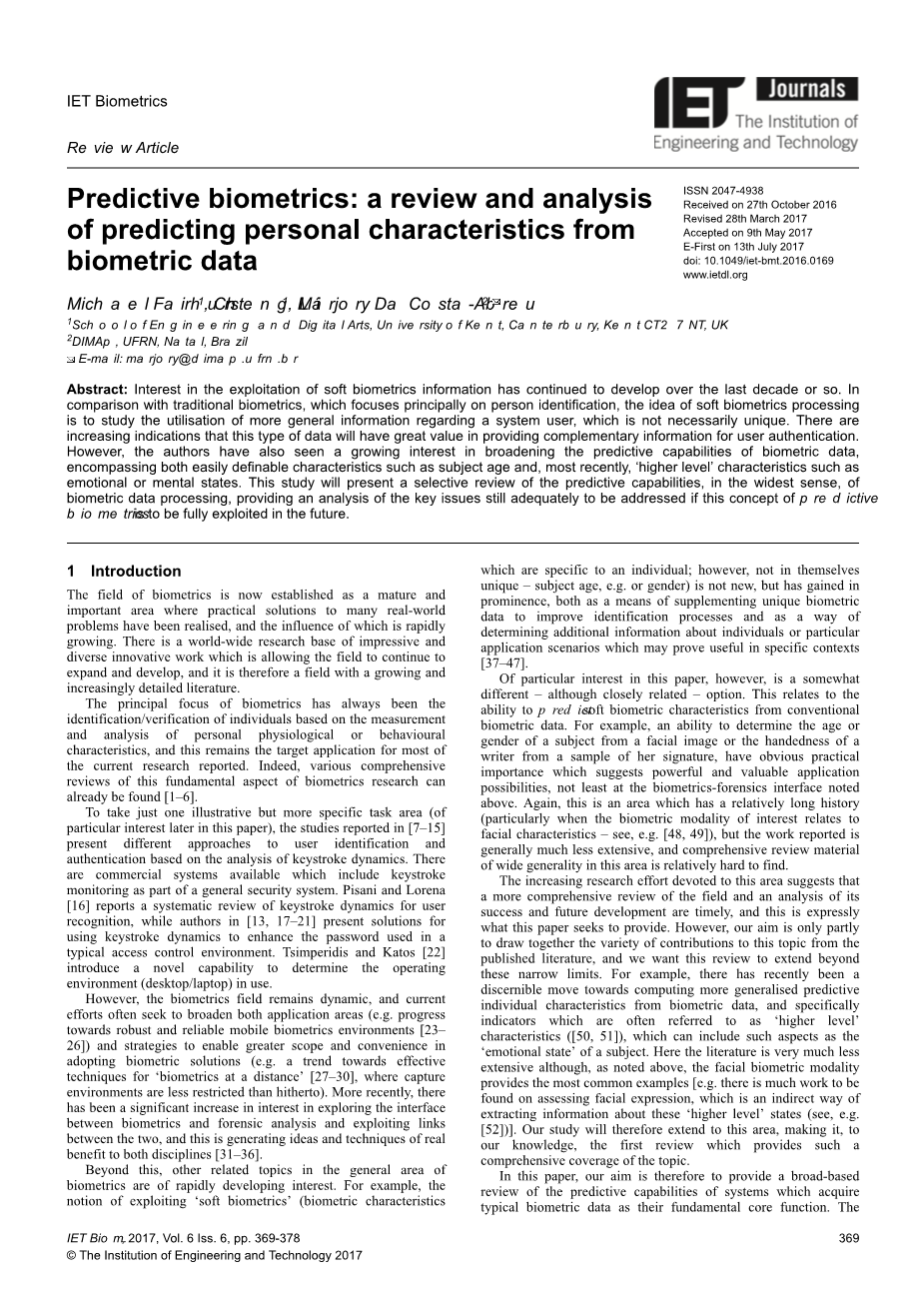 致力于这一领域的研究工作越来越多,这表明对该领域进行更全面的审查,并对其成功和未来发展进行分析是及时的,这正是本文的明确目标。然而,我们的目标只是从已发表的文献中收集对这一主题的各种贡献,我们希望这篇综述能够超越这些狭窄的限制。例如,最近出现了一种明显的趋势,即从生物特征数据中计算出更一般化的预测个体特征,特别是通常被称为“更高层次”特征的指标([50,51]),这些特征可以包括受试者的“情绪状态”等方面。这里的文献要少的多,尽管如上所述,面部生物特征提供了最常见的例子。在评估面部表情方面还有很多工作要做,这是一种提取这些“高级”状态信息的间接方式(如[52])。因此,我们的研究将扩展到这一领域,据我们所知,这是第一次对这一主题进行如此全面的审查。