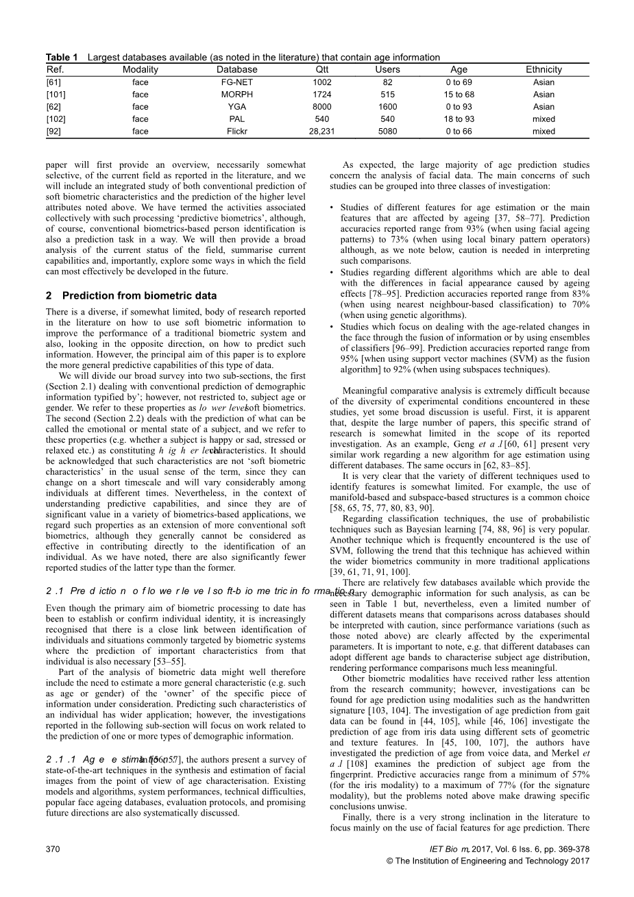 2.1.2性别预测:再次声明,大多数性别预测论文关注的是面部数据的分析(如[47,109-115])。这些研究的主要重点是利用PCA对人脸进行目标识别,利用SVM进行性别分类。与前面的例子一样,表2显示,提供这类研究所需数据的数据库数量有限。报告的预测精度范围从91%(使用带人脸模式的贝叶斯算法时)到95%(使用带有击键动力学的SVM时)。上节所提到的这些研究的对比性分析的生产的许多相同的困难适用于这个情况,虽然性别类别分配给对象的问题不如年龄的,特定的年龄通常是包含在一组更一般的年龄测量范围。