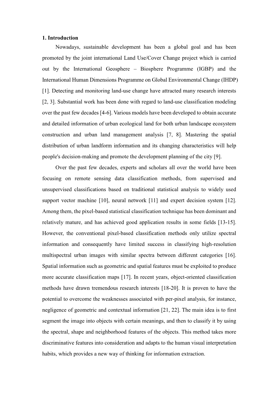 目前,可持续发展已经成为一项全球的目标,并由国际地圈-生物圈计划(IGBP)和国际全球环境变化的人文因素计划(IHDP)联合开展的国际土地利用和土地覆盖变化的项目得到推动,土地利用变化的监测与检测引起了众多研究人员的兴趣。在过去的几十年中,在土地利用分类模型方面已经做出了大量工作。为了获得准确、详细的城市土地生态信息,进行城市生态景观系统的建设和土地管理分析,已经开发出各种模型。掌握城市地貌信息的空间分布及其变化特征,可以有助于人们做出决策,并促进城市未来的发展规划。