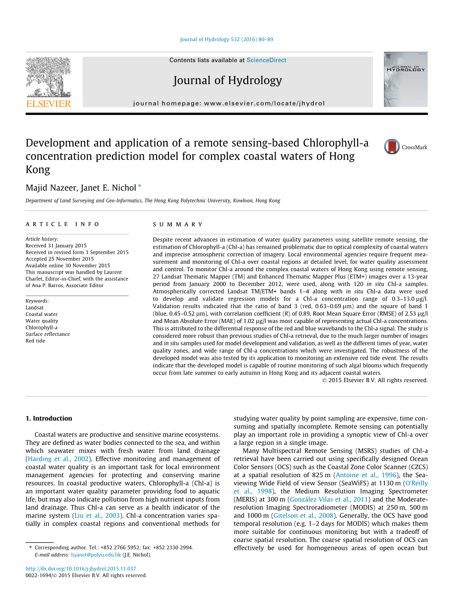关键词:沿海水体,水质建模,Landsat,HJ-1 A/B CCD