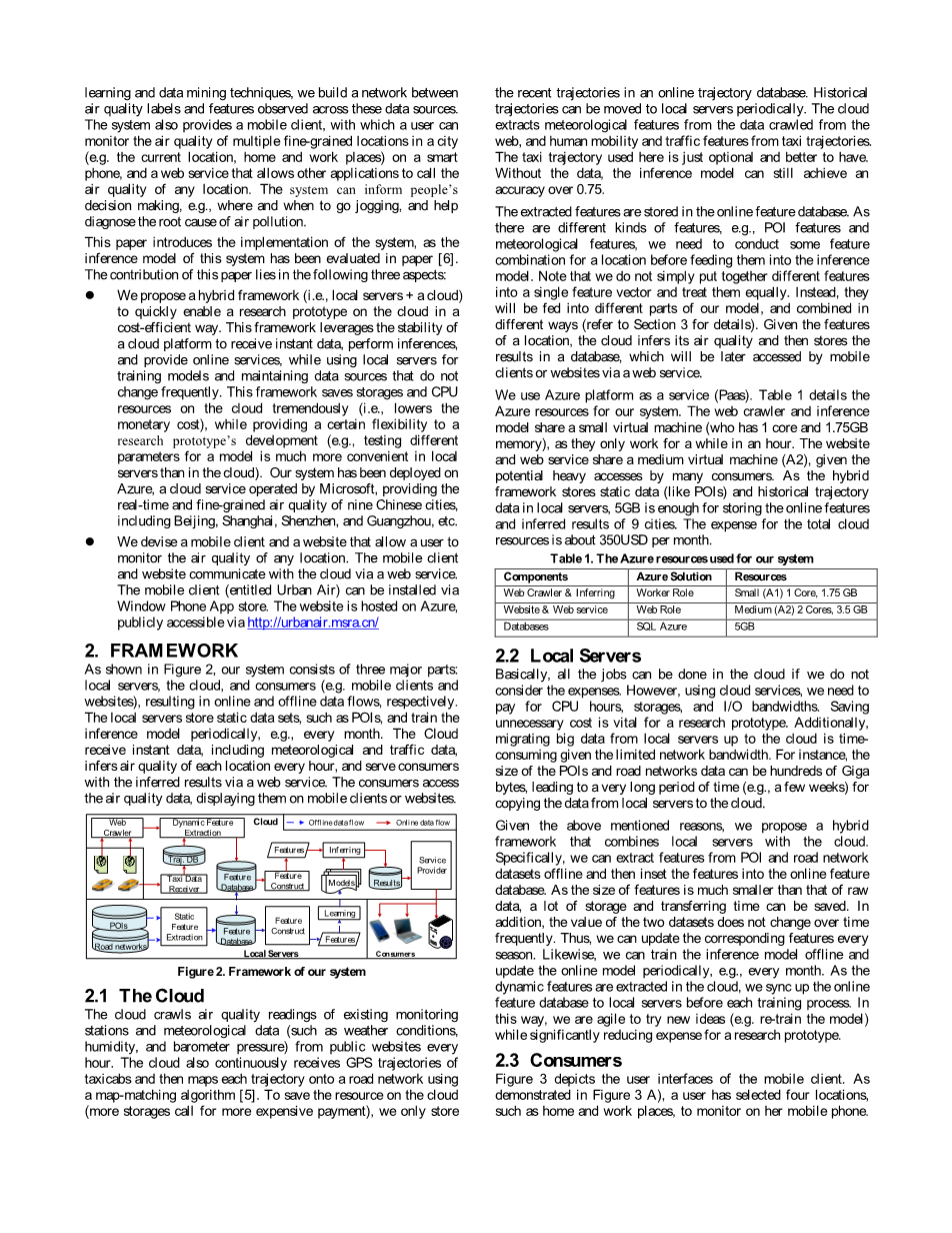 我们提出了一个混合框架(即本地服务器 云端),以一种经济高效的方式在云端上快速实现研究原型。该框架利用云平台的稳定性来接收即时数据、执行推断和提供在线服务,同时使用本地服务器来训练模型和维护不经常更改的数据源。该框架极大地节省了云端上的存储和CPU资源(即降低了货币成本),同时为研究原型的开发提供了一定的灵活性(例如,在本地服务器上测试模型的不同参数比在云端方便得多)。我们的系统已部署在微软运营的云服务Azure上,提供北京、上海、深圳、广州等九个中国城市的实时细粒度空气质量数据。