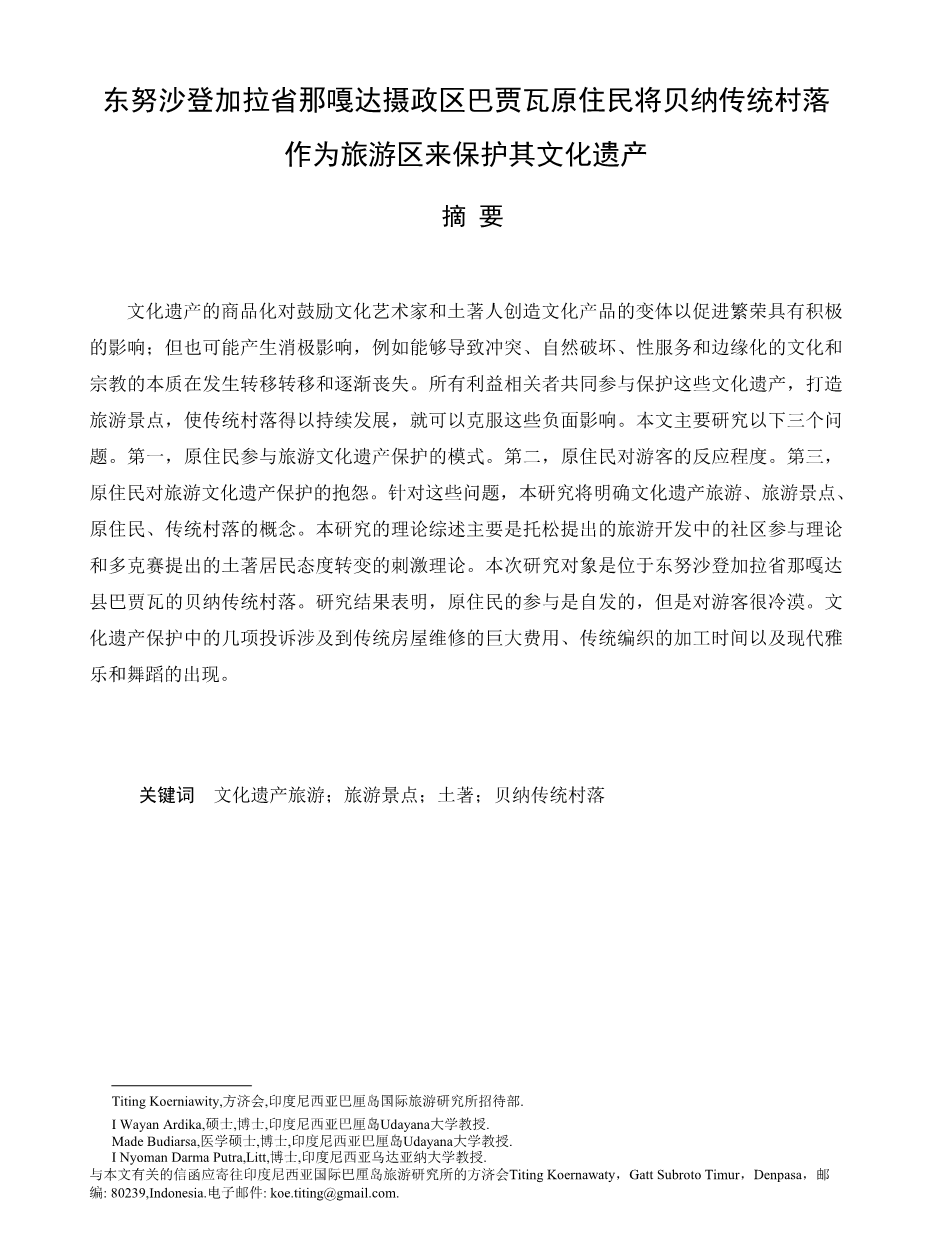 东努沙登加拉省那嘎达摄政区巴贾瓦原住民将贝纳传统村落 作为旅游区来保护其文化遗产外文翻译资料