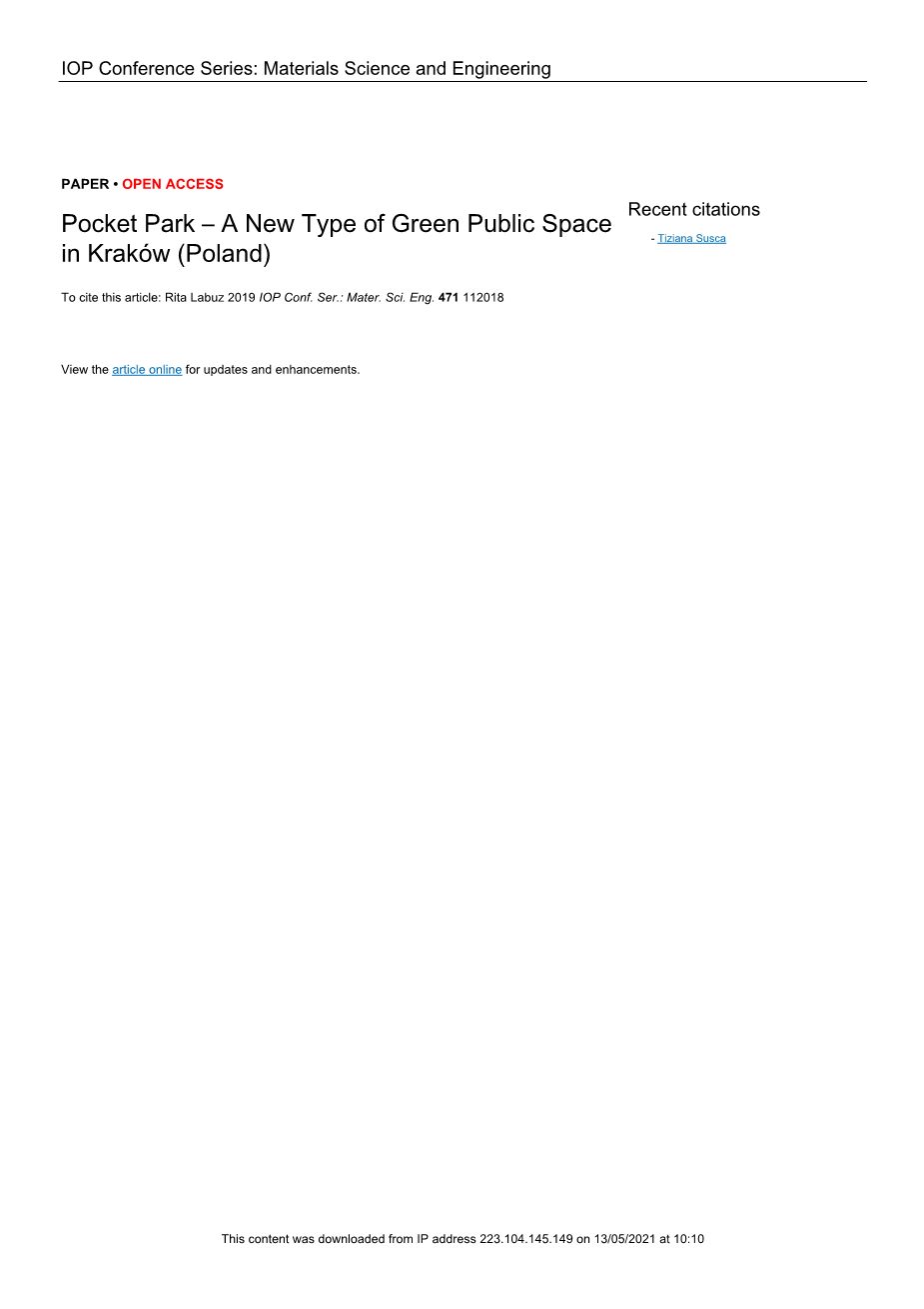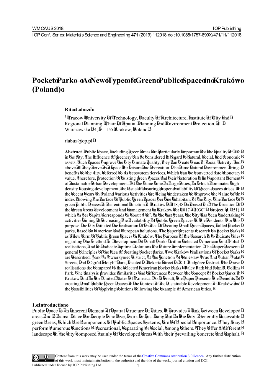 公共空间,包括绿地,对城市的生活质量尤为重要。绿化的影响可以体现在在自然,社会和经济资产。这样的空间改善了城市的气候质量,他们可以创造社会活动的区域,最重要的是,他们作为一个休闲和娱乐的空间。同样的自然环境给城市带来的利益,称为生态系统服务,可以转化为货币价值。因此,现有绿地的保护和恢复是城市可持续发展的重要内容。与此同时,在大城市,在高密度的住宅开发中占主导地位,确保适当的绿地可用性的问题出现了。近年来,波兰正在开展各种活动,以提高显示城市每一居民公共绿地表面的指数的价值。克拉科夫绿地休闲功能公共空间表面面积为618 48公顷(根据《克拉科夫2017 - 2030年绿地开发与管理方向》项目,第151页),人均对应约8平方米。在过去的几年里,该城市一直在开展活动,旨在增加公共绿地对居民的可用性。为此,该城市基于美国和欧洲的解决方案,提出了创建小型绿色空间的想法,称为口袋公园。本文介绍了口袋公园作为一种新的公共绿地形式在克拉科夫的研究。研究的目的是指出在选定的美国和波兰实现的小型公园的发展方法的规则,并指出未来实施的最佳解决方案。本文介绍了创建口袋公园思想的一般原理。描述了两个克拉科夫实现的口袋公园:公园在兹维日涅茨区,在两个街道的交汇处。上述实现是比较选定的美国口袋公园-佩利公园和约翰柯林斯公园。分析克拉科夫和美国口袋公园概念的异同点。因此,本文提出了在克拉科夫可持续发展背景下创建小型公共绿地的好处,以及借鉴美国城市的解决方案的可能性。