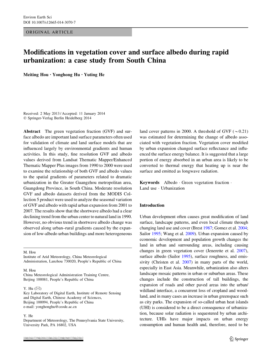 关键词:反照率 绿色植被分数 土地利用 城市化