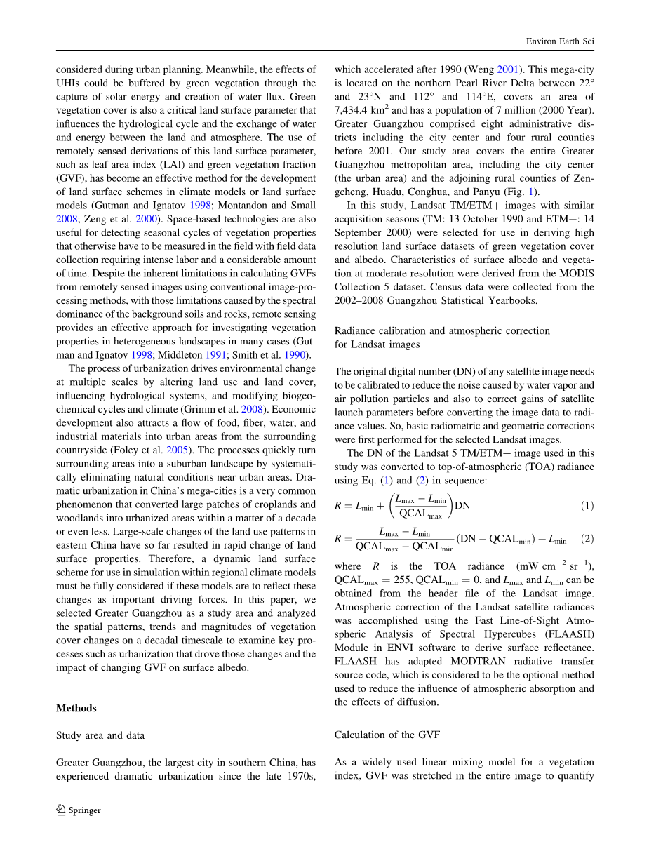 城市化进程通过改变土地利用和土地覆盖,影响水文系统,改变生物地球化学循环和气候,驱使了多尺度的环境变化(Grimm et al.2008),经济发展也吸引了周边农村将食物、纤维、水和工业材料流入市区(Foley et al.2005)。这些过程通过系统地消除城市附近的自然条件,将周边地区快速转变为郊区景观。中国大城市的戏剧性城市化是一个非常普遍的现象,能在十年甚至更少的时间内将大片农田和林地转化为城市化地区,而中国东部的土地利用格局大幅度变化,导致地表特性快速变化,因此,如果这些模型将这些变化作为重要的推动力,就必须充分考虑区域气候模式中用于模拟的动态地表计划。在本文中,我们选择大广州作为研究区域,分析了年代际时间尺度上植被覆盖变化的空间格局、趋势和幅度,以检查推动这些变化的城市化等关键过程以及改变GVF对地面反照率的影响。