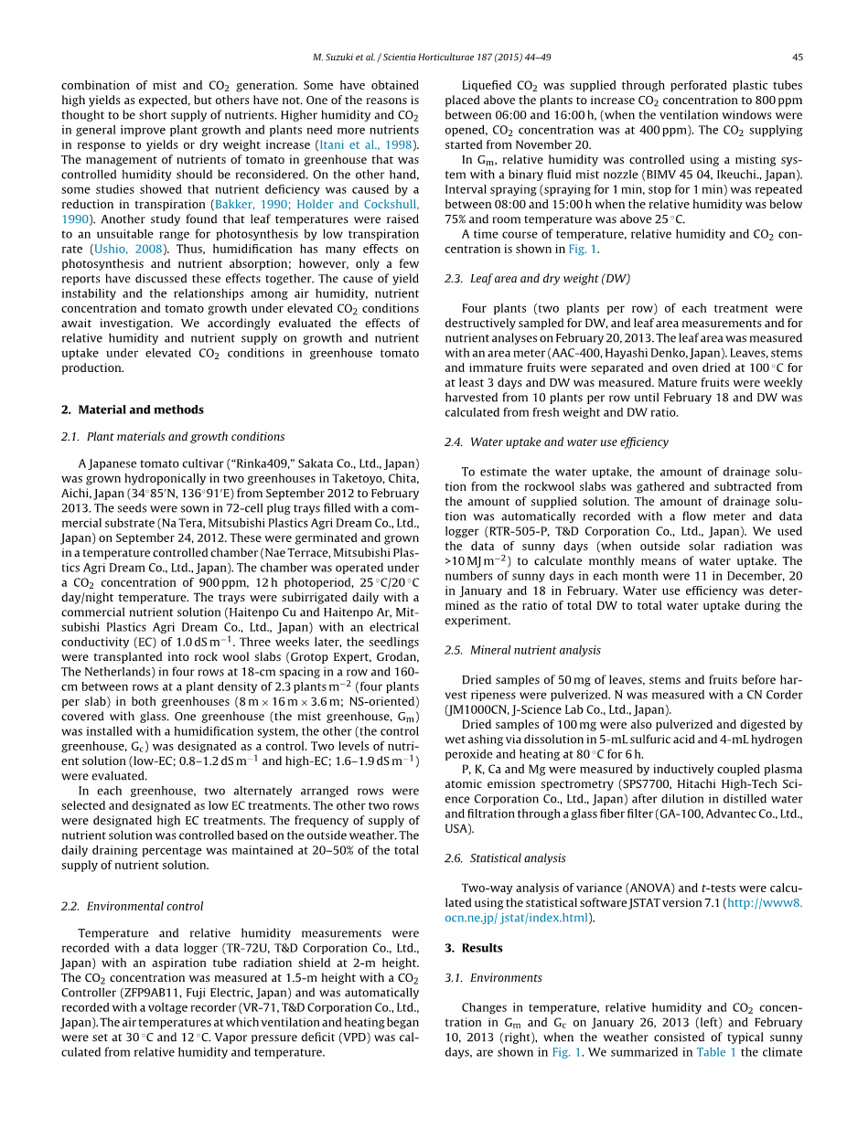用数据记录仪(TR-72U,T&D Corporation Co.,Ltd.,Japan)测量并记录下温度和相对湿度。 使用CO2控制器(ZFP9AB11,Fuji Electric,Japan)在1.5m高度处测量CO2浓度,并用电压记录仪(VR-71,T&D Corporation Co.,Ltd,Japan)自动记录。 开始通气和加热的空气温度分别设定在30°C和12°C。通过相对湿度和温度计算可得出饱和水汽压差(VPD)。