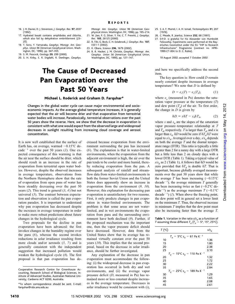对水面蒸发量减少的任何解释都必须包含以下内容:(i)在干燥和潮湿的环境中均发生水面蒸发量的减少,(ii)尽管平均温度增加,但平均蒸汽压(D,以Pa为单位)亏损仍然或多或少保持不变。太阳辐射的减少与(i)一致,在这里我们具体说明第二项。