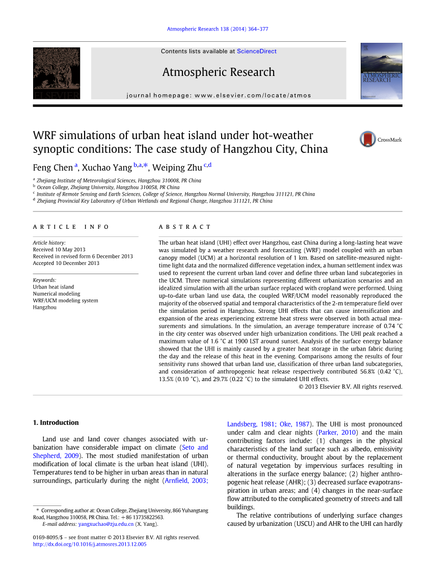 关键词:城市热岛;数值模拟;WRF/UCM建模系统;杭州