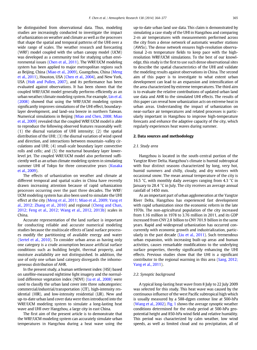 由于过去三十年来城市化进程迅速发展,中国不同时空尺度的城市化对天气和气候的影响日益引起人们的关注。WRF / UCM建模系统也被用于模拟中国城市(Meng et al., 2011; Miao et al., 2009; Yang et al., 2012; Zhang et al., 2010)和区域尺度(Cheng and Chan, 2012; Feng et al., 2012; Wang et al., 2012, 2013b)的热岛效应。