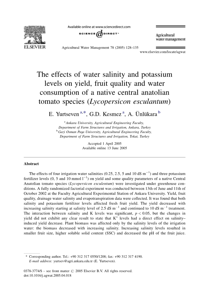 灌溉水盐分含量和钾对安那托利亚中部番茄的的耗水、产量与果实品质的影响外文翻译资料